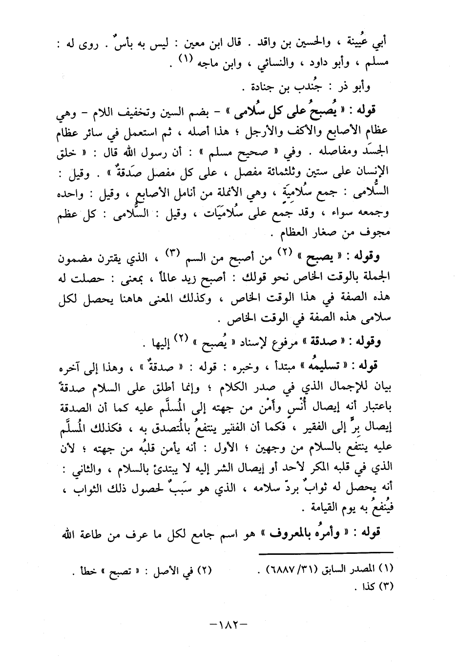 قوله: " يُصبحُ على كل سُلامى "- بضم السين وتخفيف اللام- وهي عظام الأصابع والأكف والأرجل , هذا أصله، ثم استعمل في سائر عظام الجسَد ومفاصله. وفي " صحيح مسلم ": أن رسول الله قال: " خلق الإنسان على ستين وثلثمائة مفصل، على كل مفصل صَدقةٌ ". وقيل: السلامى: جمع سُلامِيَةٍ، وهي الأنملة من أنامل الأصابع، وقيل: واحده وجمعه سواء، وقد جمع على سُلامَيات، وقيل: السّلامي: كل عظم مجوف من صغار العظام.