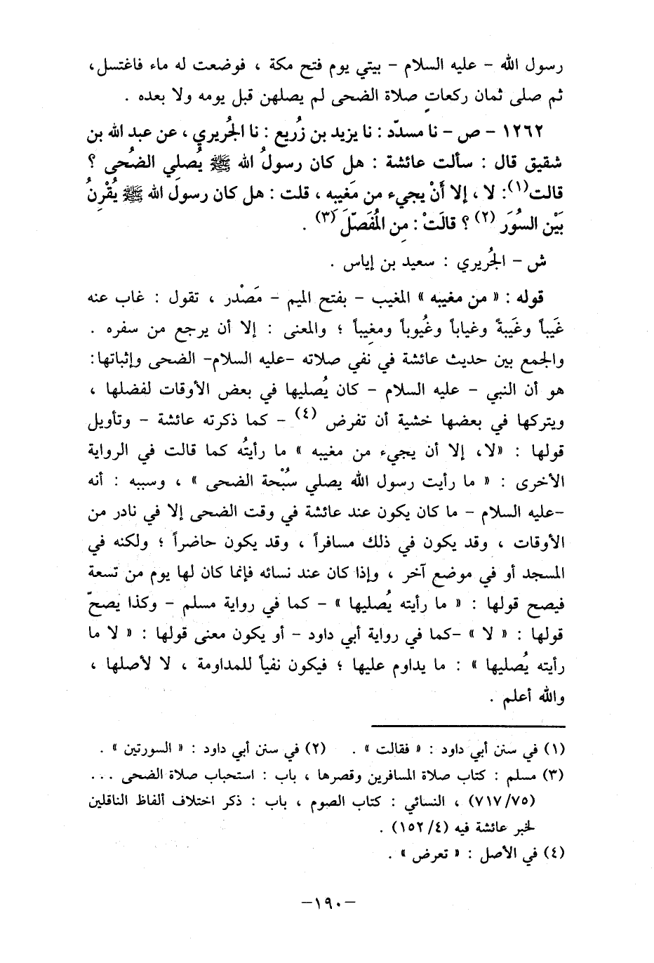 1262- ص- نا مسدد: نا يزيد بن زُريع: نا الجُريري، عن عبد الله بن شقيق قال: سألت عائشة: هلِ كان رسولُ الله صلى الله عليه وسلم يُصلي الضُحى؟ قالت (1) : لا، إلا أنْ يجيء من مغيبه، قلت: هل كان رسولَ الله صلى الله عليه وسلم يُقْرِنُ بَيْن السُوَر (2) ؟ قالَتْ: مِن المُفَصّلً (3) .