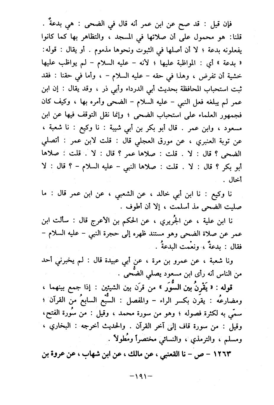 فإن قيل: قد صح عن ابن عمر أنه قال في الضحى: هي بدعة. قلنا: هو محمول على أن صلاتها في المسجد، والتظاهر بها كما كانوا يفعلونه بدعة؛ لا أن أصلها في الثبوت ونحوها مذموم. أو يقال: قوله: " بدعة " أي: المواظبة عليها؛ لأنه- عليه السلام- لم يواظب عليها خشية أن تفرض، وهذا في حقه- عليه السلام-، وأما في حقنا: فقد ثبت استحباب المحافظة بحديث أبي الدرداء وأبي ذر وقد يقال: إن ابن عمر لم يبلغه فعل النبي- عليه السلام- الضحى وأمره بها، وكيف كان فجمهور العلماء على استحباب الضحى , وإنما نقل التوقف فيها عن ابن مسعود، وابن عمر. قال أبو بكر بن أبي شيبة: نا وكيع: لا شعبة، عن توبة العنبري، عن مورق العجلي قال: قلت لابن عمر: أتصلي الضحى؟ قال: لا. قلت: صلاها عمر؟ قال: لا. قلت: صلاها أبو بكر؟ قال: لا. قلت: صلاها النبي- عليه السلام-؟ قال: لا أخال.