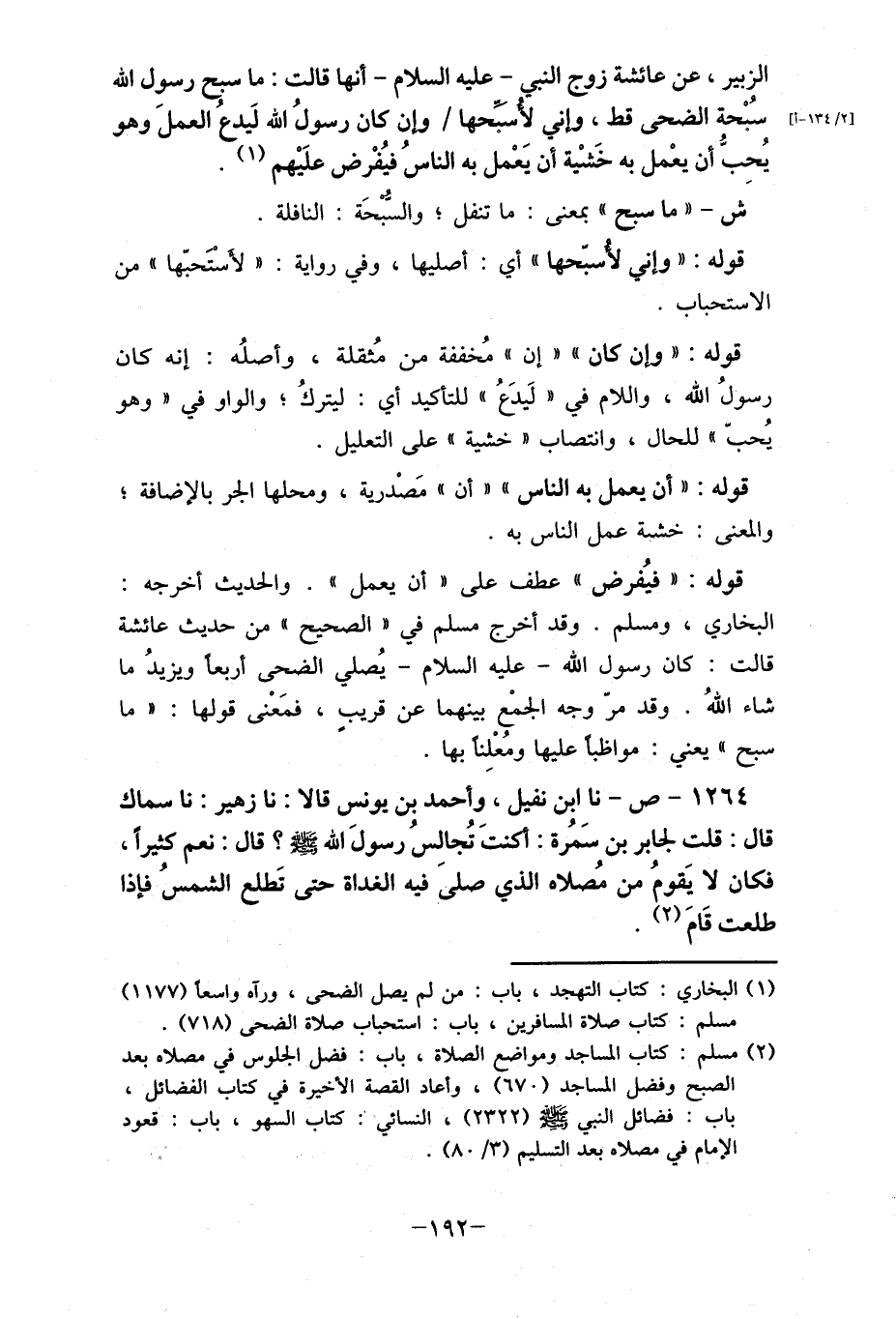 الزبير، عن عائشة زوج النبي- عليه السلام- أنها قالت: ما سبح رسول الله سُبْحة الضحى قط، وإني لأسبحها / وإن كان رسولُ الله لَيدعُ العملَ وهو يُحِبُّ أن يعْمل به خَشْية أن يَعْمل به الناس فيُفْرض علَيْهم (1) .