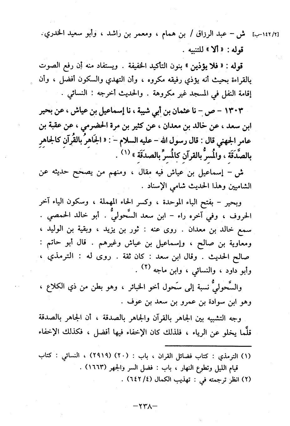 عامر الجهني قال: قال رسول الله- عليه السلام - ْ: " الجَاهِرُ بالقُرآنِ كالجاهِرِ بالصَدَقَةِ، والمُسِرُّ بالقرآنِ كالمُسِرِّ بالصدَقَةِ " (1) .