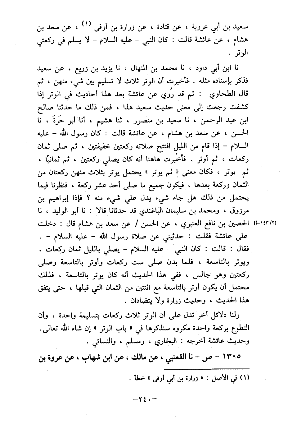 سعيد بن أبي عروبة، عن قتادة، عن زرارة بن أوفى (1) ، عن سعد بن هشام، عن عائشة قالت: كان النبي- عليه السلام- لا يسلم في ركعتي الوتر.