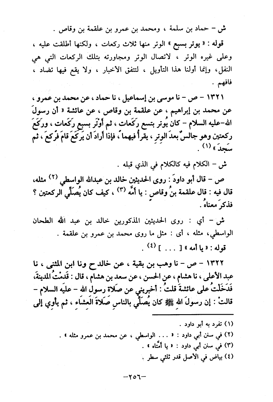 1321- ص- نا موسى بن إسماعيل، نا حماد، عن محمد بن عمرو، عن محمد بن إبراهيم، عن علقمة بن وقاص، عن عائشة " أن رسولَ الله- عليه السلام- كان يُوتر بتسع رَكَعات، ثم أَوْتَر بسبع رَكَعات، ورَكَعَ ركعتين وهو جالس بعدَ الوِترِ، يقرأ فيهما، فإذا أرادَ أن يَركَعَ قامَ فركعَ، ثم سَجدَ " (1) .