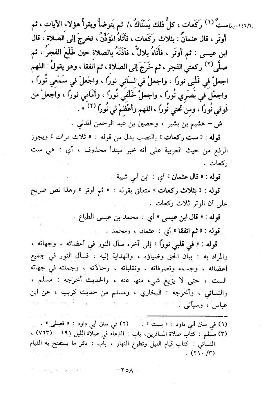 [2/ 146- ب] ستَّ (1) رَكَعات، كلُّ ذلك يَسْتَاكُ،/ ثم يَتوضأُ ويقرأُ هؤلاء الآيات، ثم أوتَر، قال عثمان: بثلاث رَكَعات، فأَتَاهُ المؤَذنُ، فخرجَ إلى اَلصلاة، قال
