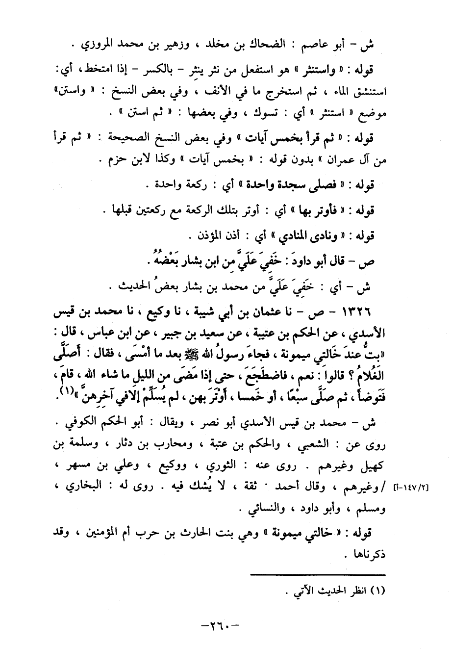 " بت عندَ خَالتِي ميمونة، فجاءَ رسولُ الله صلى الله عليه وسلم بعد ما أمْسَى، فقال: أَصلى الَغُلامُ؟ قالوا: نعم، فاضطَجَعَ، حتى إذا مَضَى من الليلِ ما شاء الله، قامَ، فَتَوضأ، ثم صلى سبْعَا، أو خَمسا، أَوْتَرَ بهن، لم يُسَلمْ إلا في آخِرِهن " (1) .