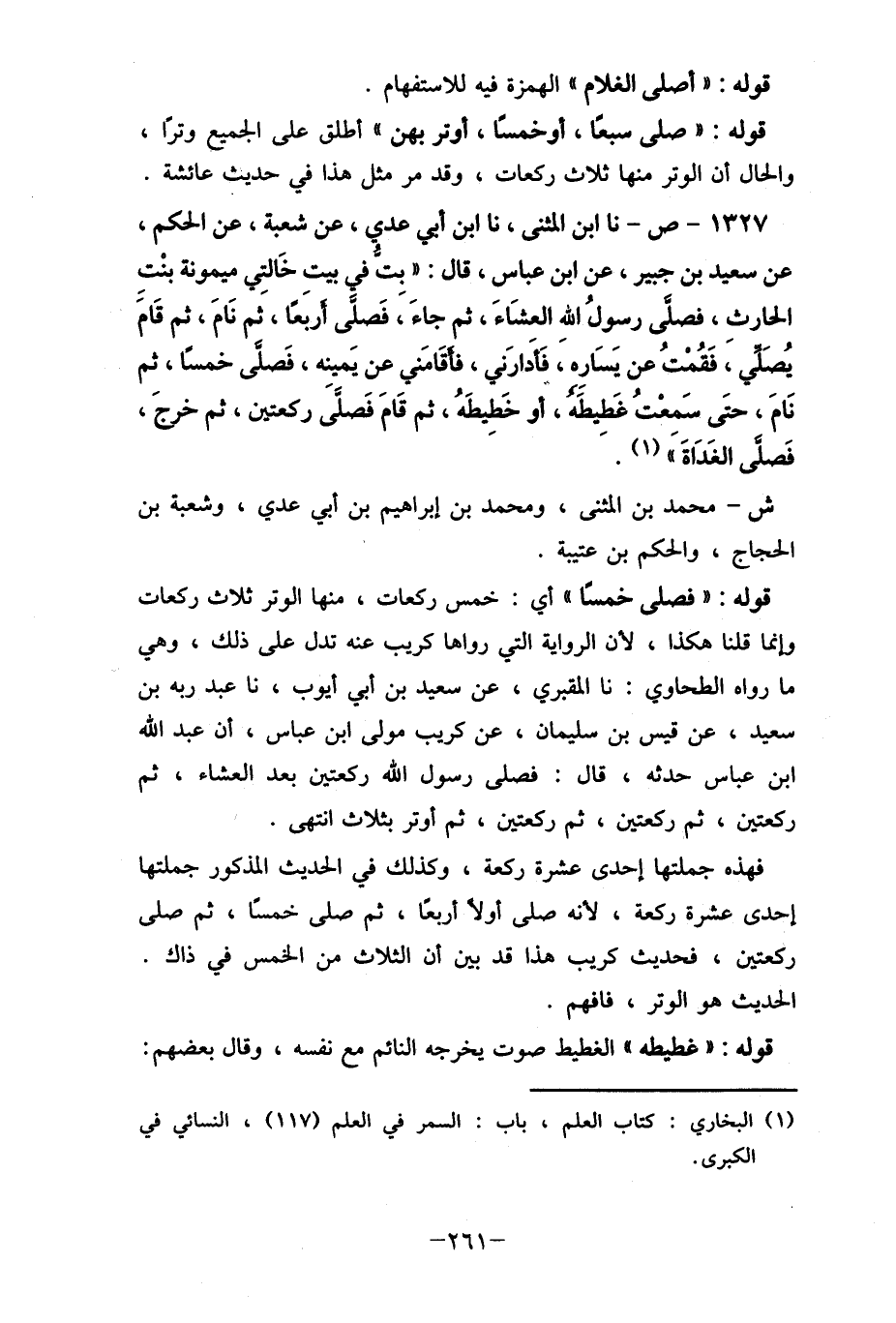 1327- ص- نا ابن المثنى، نا ابن أبي عدي، عن شعبة، عن الحكم، عن سعيد بن جبير، عن ابن عباس، قال: " بت في بيت خَالتِي ميمونة بنْت الحارث، فصلى رسولُ الله العشَاءَ، ثم جاءَ، فَصلى أربَعًا، ثم نَامَ، ثم قَام يُصَلي، فَقُمْتُ عن يَسَارِه، فأدَارَني، فأقَامَني عن يَمينه، فصلى خمسًا، ثم نَامَ، حتَى سَمعْتُ غطيطَه، أو خَطيطَهُ، ثم قَامَ فَصلى ركعتين، ثم خرجَ، فصلى الغَدَاة " (1) .َ