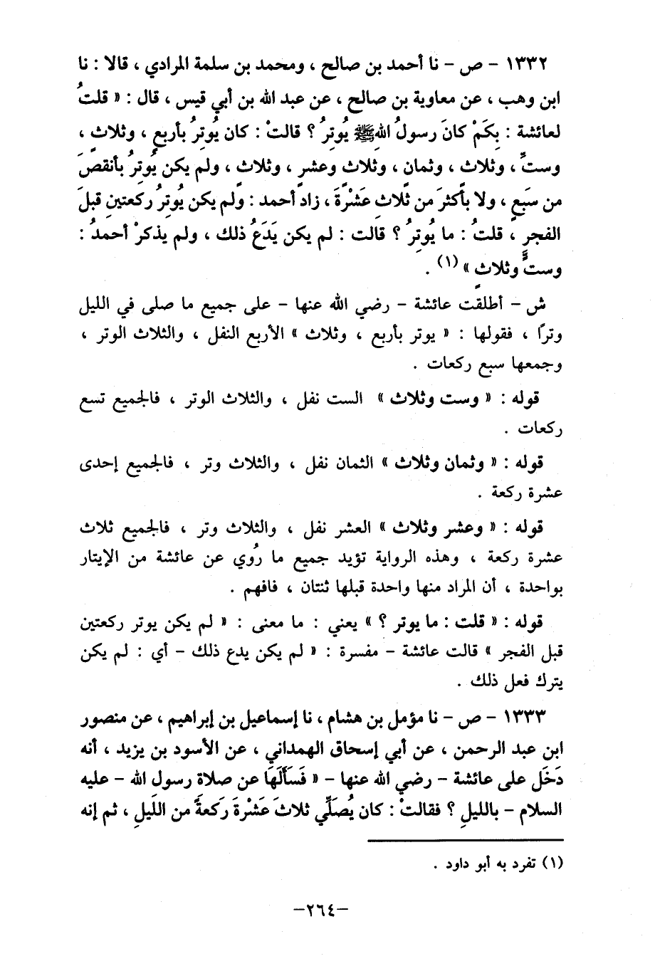 1333- ص- نا مؤمل بن هشام، نا إسماعيل بن إبراهيم، عن منصور ابن عبد الرحمن، عن أبي إسحاق الهمداني، عن الأسود بن يزيد، أنه دَخَل على عائشة- رضي الله عنها- " فسَألَهَا عن صلاة رسول الله- عليه السلام- بالليلِ؟ فقالتْ: كان يُصَلي ثلاثَ عَشْرةَ رَكعةً من اللَيلِ، ثم إنه