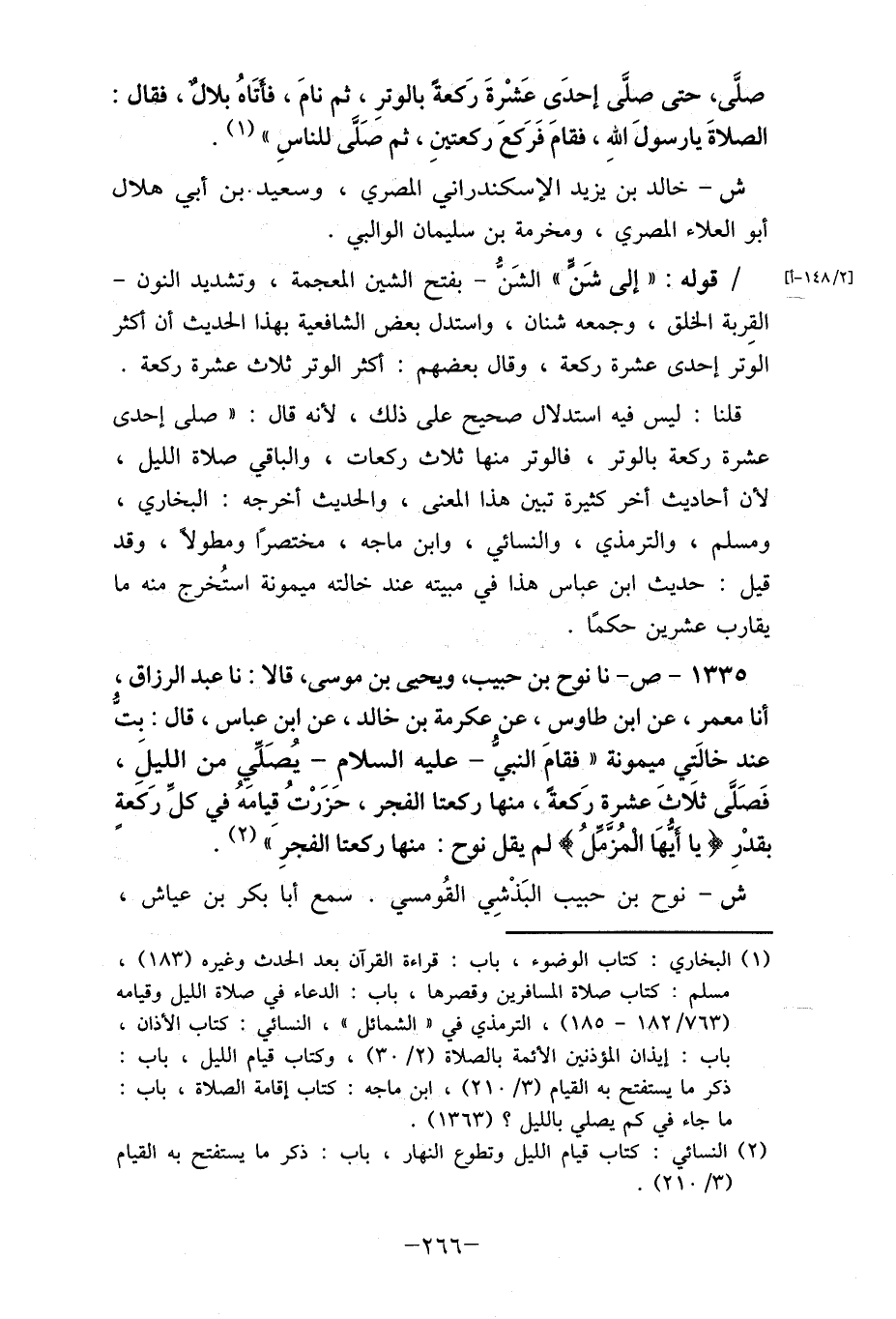 1335- ص- نا نوح بن حبيب ويحيى بن موسى، قالا: نا عبد الرزاق، أنا معمر، عن ابن طاوس، عن عكرمة بن خالد، عن ابن عباس، قال: بتُّ عند خالَتي ميمونة " فقامَ النبيُّ- عليه السلامِ- يُصَلِّيِ من الليلِ، فَصَلَّى ثلَاثَ عشرة رَكعةً، منها ركعتا الفجر، حزَرْتُ قيامه في كلِّ رَكعة بقدْرِ {يا أيُّهَا المُزَّمِّلُ} لم يقل نوح: منها ركعتا الفجرَِ " (2) .