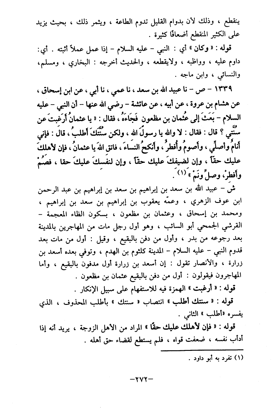 1339- ص- نا عبيد الله بن سعد، ناعمي، نا أبي، عن ابن إسحاق، عن هشام بن عروة، عن أبيه، عن عائشة- رضي الله عنها- أن النبي- عليه السلام- بَعَثَ إلى عُثمان بن مظعون فَجَاءَهُ، فقال: " يا عثمانُ أرَغبتَ عن سُنتي؟ قال: فقال: لا والله يا رسول الله، ولكن سُنتكَ أطلبُ، قالَ: فإني أنام وأصلي، وأصومُ وأفطر، وأنكحُ النسَاءَ، فاتقِ الله يا عثمانُ، فإن لأهلِكَ عليك حقا، وإن لِضيفِكَ عليك حقا، وإن لنفسِكَ عليكَ حقا، فصُمْ وأفطِرْ، وصل ونَمْ " (1) .