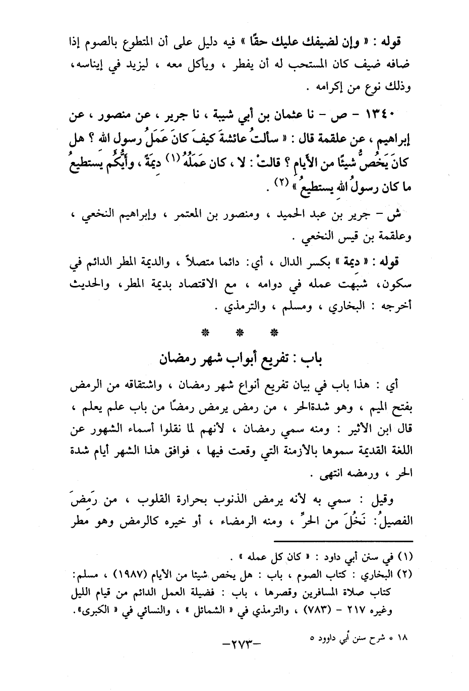 1340- ص- نا عثمان بن أبي شيبة، نا جرير، عن منصور، عن إبراهيم، عن علقمة قال: " سألتُ عائشةَ كيفَ كانَ عَمَلُ رسول الله؟ هل كانَ يَخُص شيئًا من الأيام؟ قالتْ: لا، كان عَمَلُهُ (1) ديمَةً، وأيكم يَستطيعُ ما كان رسولُ الله يستطيعُ " (2) .