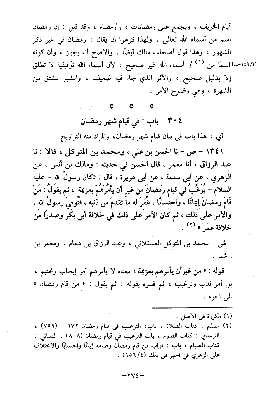 1341- ص- نا الحسن بن علي، ومحمد بن المتوكل، قالا: نا عبد الرزاق، أنا معمر، قال الحسن في حديثه: ومالك بن أنس، عن الزهري، عن أبي سلمة، عن أبي هريرة، قال: " كان رسولُ اللهِ- عليه السلام- يُرَغِبُ في قيام رَمضانَ من غيرِ أن يأمُرَهُمْ بعزيمة، ثِم يقولُ: مَنْ قَامَ رمضانَ إيمانًا، واحتسابًا، غُفِرَ له ما تقدمَ من ذنبه، فتوفي رسول الله، والأمر علىَِ ذلك، ثم كان الأمر على ذلك في خلافة أبي بكَر وصدرًا مَن خلافة عمر " (2) .