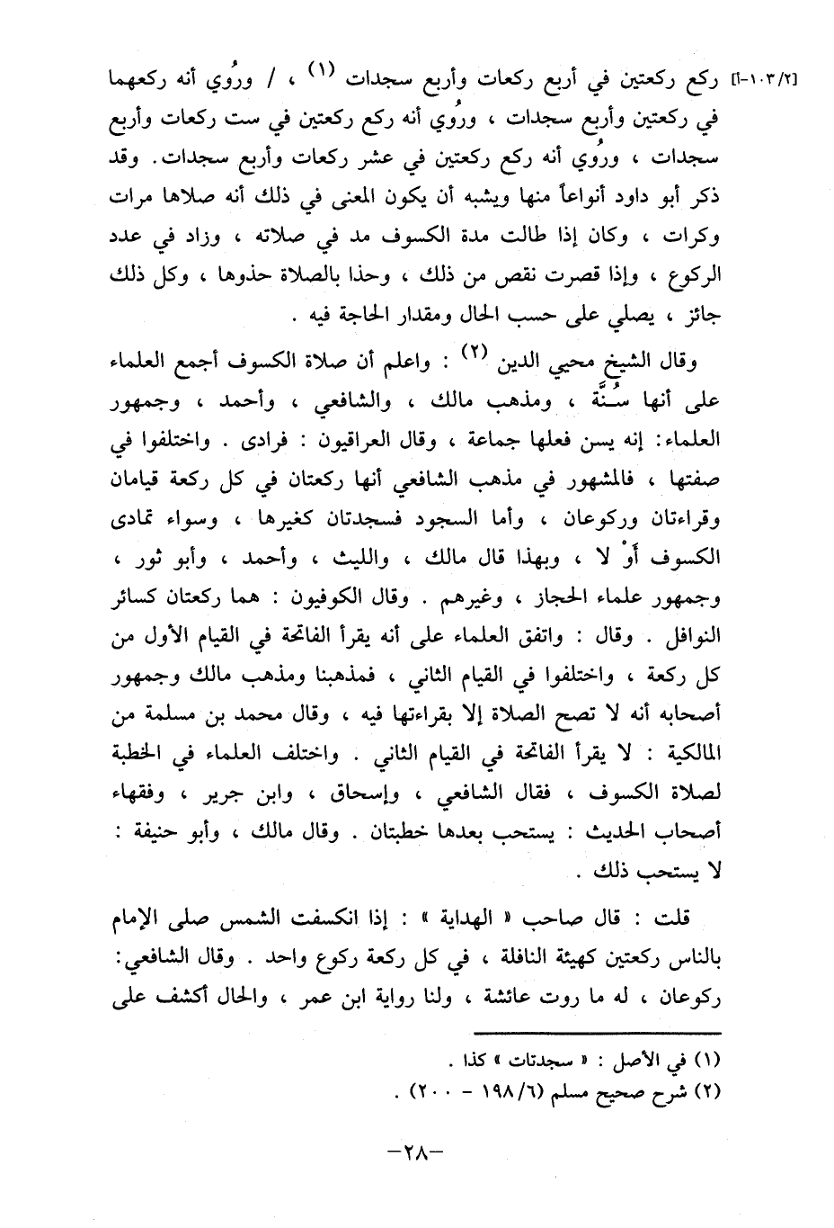 وقال الشيخ محيي الدين (2) : واعلم أن صلاة الكسوف أجمع العلماء على أنها سُنة، ومذهب مالك، والشافعي، وأحمد، وجمهور العلماء: إنه يسن فعلها جماعة، وقال العراقيون: فرادى. واختلفوا في صفتها، فالمشهور في مذهب الشافعي أنها ركعتان في كل ركعة قيامان وقراءتان وركوعان، وأما السجود فسجدتان كغيرها، وسواء تمادى الكسوف أو لا، وبهذا قال مالك، والليث، وأحمد، وأبو ثور، وجمهور علماء الحجاز، وغيرهم. وقال الكوفيون: هما ركعتان كسائر النوافل. وقال: واتفق العلماء على ابنه يقران الفاتحة في القيام الأول من كل ركعة، واختلفوا في القيام الثاني، فمذهبنا ومذهب مالك وجمهور أصحابه أنه لا تصح الصلاة إلا بقراءتها فيه، وقال محمد بن مسلمة من المالكية: لا يقرأ الفاتحة في القيام الثاني. واختلف العلماء في الخطبة لصلاة الكسوف، فقال الشافعي، وإسحاق، وابن جرير، وفقهاء أصحاب الحديث: يستحب بعدها خطبتان. وقال مالك، وأبو حنيفة: لا يستحب ذلك.