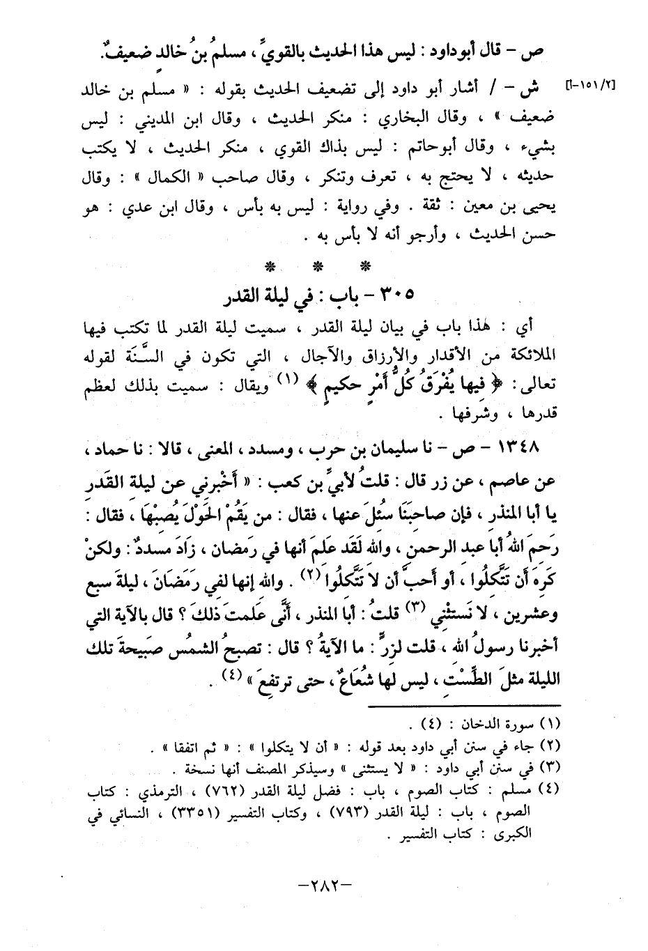 1348- ص- نا سليمان بن حرب، ومسدد، المعنى، قالا: نا حماد، عن عاصم، عن زر قال: قلتُ لأبيِّ بن كعب: نا أَخْبرنِي عن ليلة القَدرِ نا أبا المنذر، فإن صاحبَنَا سُئِلَ عنها، فقال: من يَقُمْ الحَوْلَ يُصبْهَا، فقال: رَحمَ اللهُ أباَ عبد الرحمنَ، والله لَقَد عَلمَ أنها في رَمضان، زَادَ مسَددٌ: ولكنْ كَرِهَ أن تَتَّكلُوا، أو أَحب أن لاَ تتَّكلُواَ (2) . والله إنها لفِي رَمَضَانَ، ليلةَ سبع وعشرين، لا نَستثْنِي (3) قلتُ: أبَا المنذر، أنَى عًلمتَ ذلكَ؟ قال بالآية التي أخبرنا رسولُ الله، قلت لزِرٍّ: ما الآيةُ؟ قال: تصبحُ الشمُس صَبيحةَ تلك الليلة مثلَ الطّسْتِ، ليس لها شُعَاعٌ، حتى ترتفِعَ " (4) .
