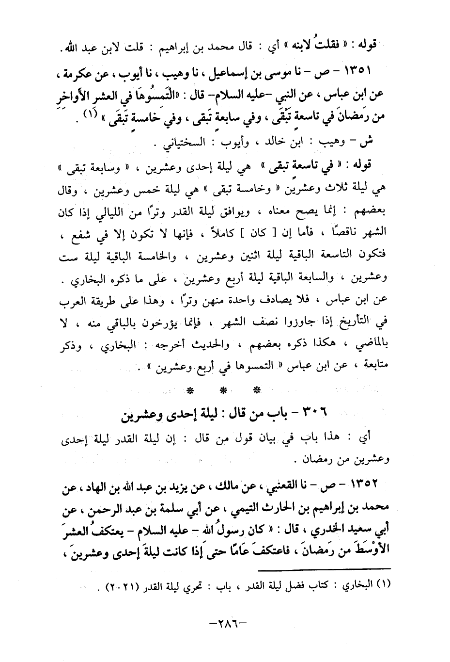 قوله: " فقلتُ لابنه " أي: قال " محمد بن إبراهيم: قلت لابن عبد الله. 1351- ص- نا موسى بن إسماعيل، نا وهيب، نا أيوب، عن عكرمة، عن ابن عباس، عن النبي " عليه السلام- قال: " التَمسُوهَا في العشر الأواخر من رَمضانَ في تاسعة تَبْقَى، وفي سابعة تَبقى، وفي خَامسة تَبقَى " (1) .ً ش- وهيب: ابن خالد، وأيوب: السختياني.
