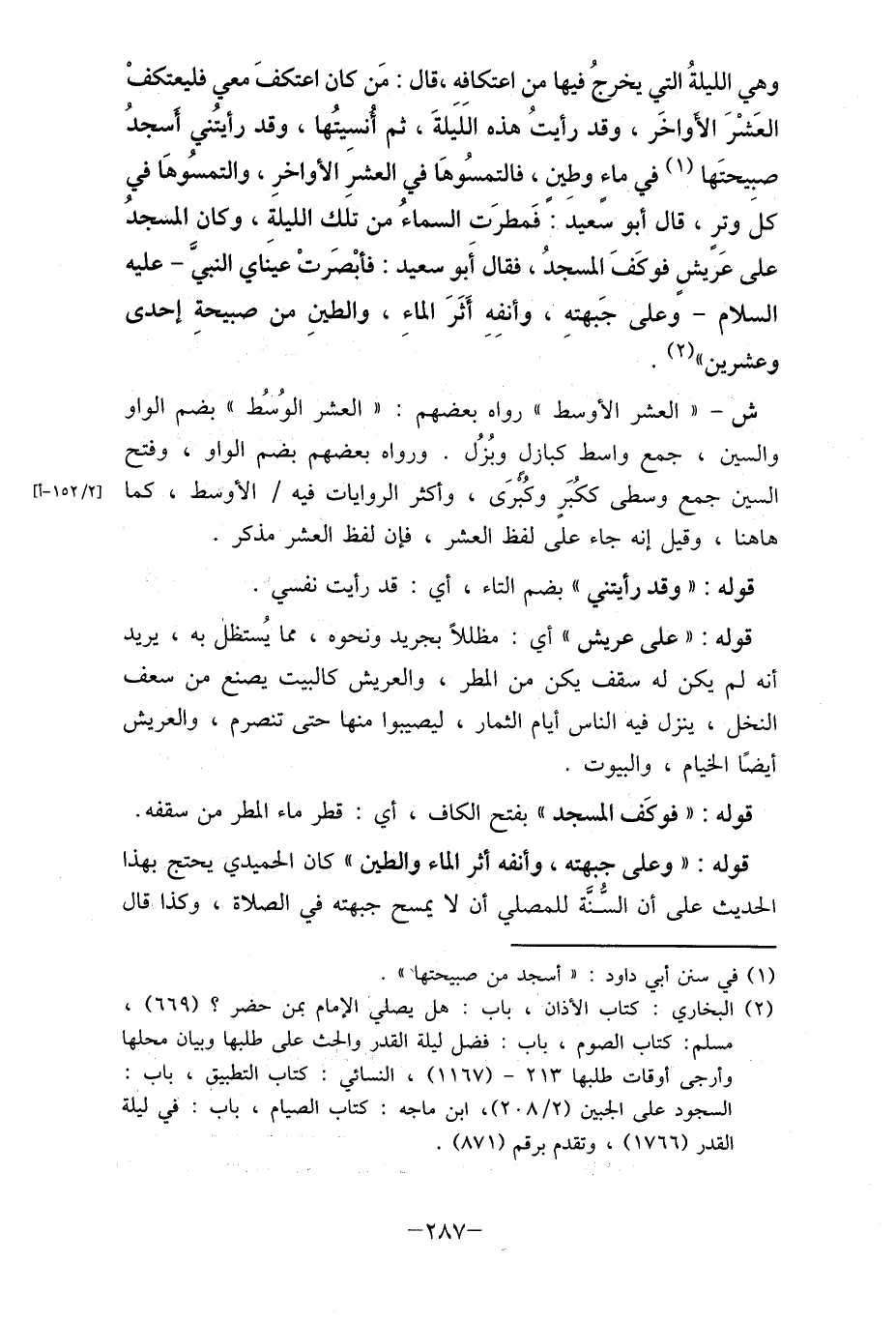 وهي الليلةُ التي يخرجُ فيها من اعتكافه، قال: مَن كان اعتكفَ معي فليعتكفْ العَشْرَ الأواخَر، وقد رأيتُ هذه الَليَلةَ، ثم أنسيتُها، وقد رأيتُني أسجدُ صبيحتَها (1) في ماء وطِين، فالتمسُوهَا في العشرَ الأواخرِ، والتمسُوهَا في كلَ وترٍ، قال أبو سًعيد: ً فَمطرَت السماءُ من تلك الليلة، وكان المسجدُ على عَريشٍ فوكَفَ المسجدُ، فقال أَبو سعيد: فأبْصَرتْ عينَاي النبيَّ- عليه السلام- وعلى جَبهته، وأنفه أَثَرَ الماء، والطين من صبيحة إحدى وعشرين " (2) .ًً