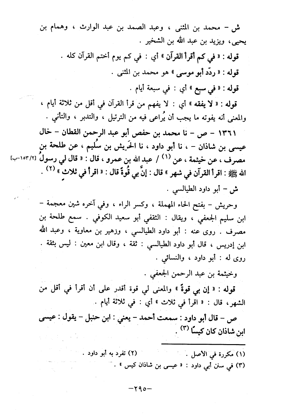 الله صَلَّى اللَّهُ عَلَيْهِ وَسَلَّمَ اقرأ القرآن في شهر " قال: إنَّ بي قُوةً قال: " اقرأ في ثلاثٍ " (2) .
