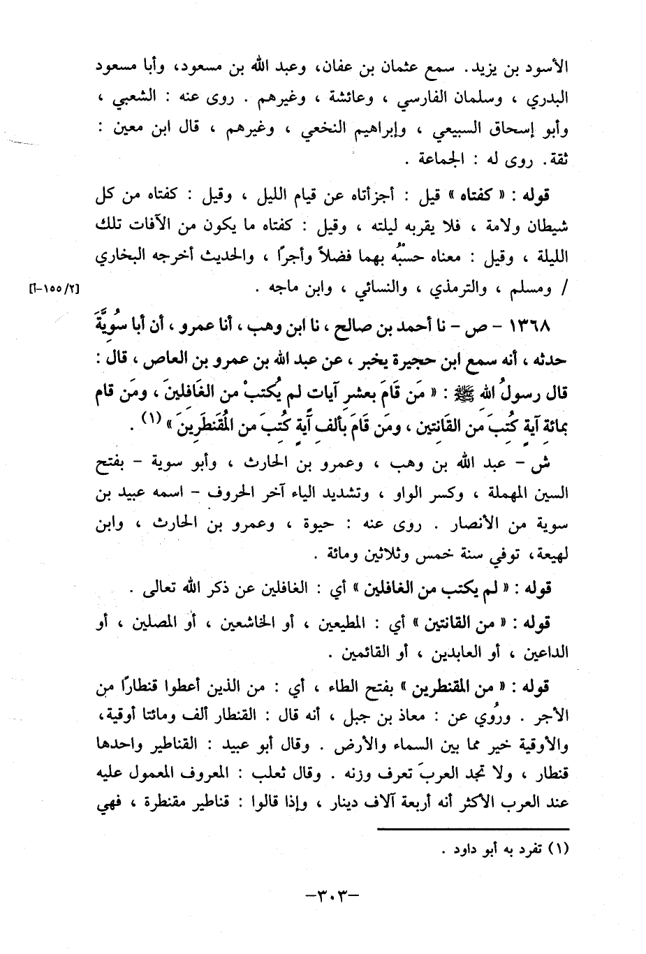 1368- ص- نا أحمد بن صالح، نا ابن وهب، أنا عمرو، أن أبا سُوِيَّةَ حدثه، أنه سمع ابن حجيرة يخبر، عن عبد الله بن عمرو بن العاص، قال: قال رسولُ الله صلى الله عليه وسلم: " مَن قَامِ بعشرِ آيات لم يُكتبْ من الغَافِلينَ، ومَن قام بمائةِ آيةٍ كُتِبَ مَن القَانِتين، ومن قَامَ بألفِ آلية كُتِبَ من المُقَنطَرِينَ " (1) . ش- عبد الله بن وهب، وعمرو بن الحارث، وأبو سوية- بفتح السين المهملة، وكسر الواو، وتشديد الياء آخر الحروف- اسمه عبيد بن سوية من الأنصار. روى عنه: حياة، وعمرو بن الحارث، وابن لهيعة، توفي سنة خمسة وثلاثين ومائة.