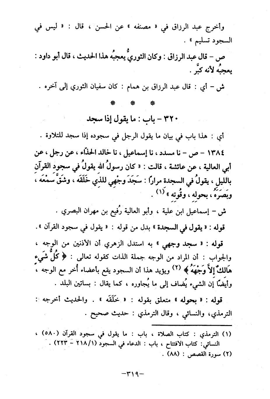 (1) الترمذي: كتاب الصلاة، باب: ما يقول في سجود القرآن (580) ، النسائي: كتاب الافتتاح، باب: الدعاء في السجود (1/ 218 - 223) . "