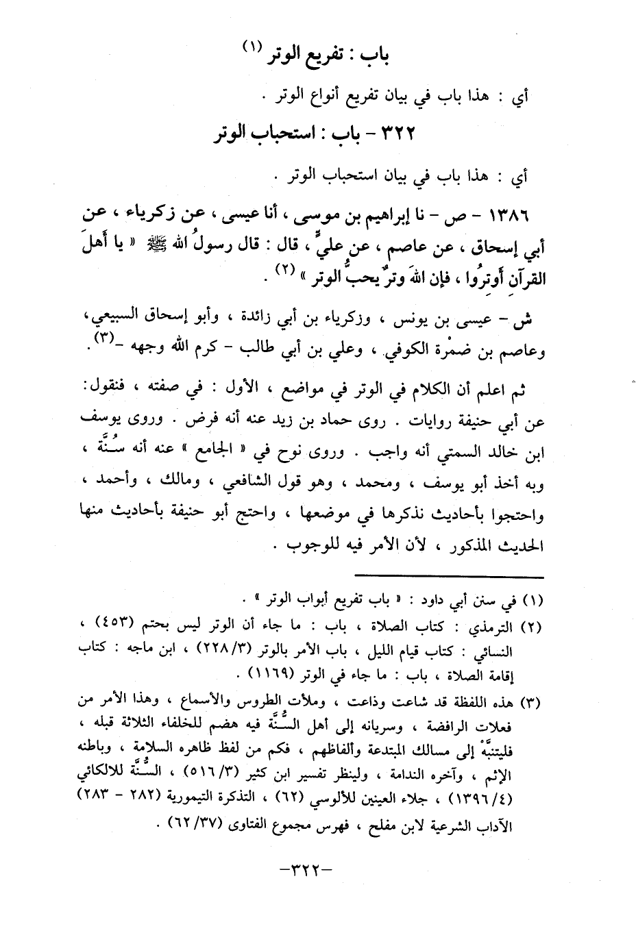 1386- ص- نا إبراهيم بن موسى، أنا عيسى، عن زكرياء، عن أبي إسحاق، عن عاصم، عن علي، قال: قال رسولُ الله صلى الله عليه وسلم " يا أهلَ القرآنِ أوتِرُوا، فإن اللهَ وتر يحبُّ الوتر " (2) .