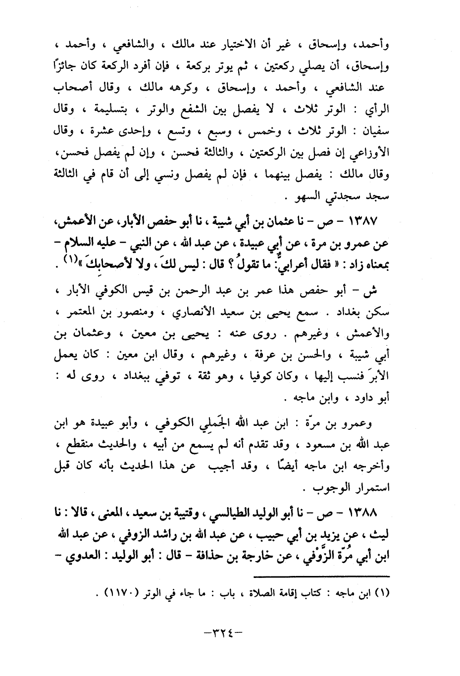 1387- ص- نا عثمان بن أبي شيبة، نا أبو حفص الأبار، عن الأعمش، عن عمرو بن مرة، عن أبي عبيدة، عن عبد الله، عن النبي- عليه السلام- بمعناه زاد: " فقال أعرابية ما تقولُ؟ قال: ليس لكَ، ولا لأصحابِكَ " (1) . ش- أبو حمص هذا عمر بن عبد الرحمن بن قيس الكوفي الأخبار، سكن بغداد. سمع يحيي بن سعيد الأنصاري، ومنصور بن المعتمر، والأعمش، وغيرهم. روى عنه: يحيى بن معين، وعثمان بن أبي شيبة، والحسن بن عرفة، وغيرهم، وقال ابن معين: كان يعمل الأبرز فنسب إليها، وكان كوفيا، وهو ثقة، توفي ببغداد، روى له: أبو داود، وابن ماجه.
