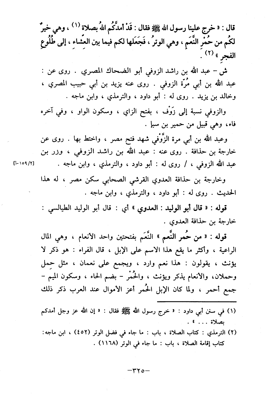 قال: " خرج علينا رسول الله صلى الله عليه وسلم فقال: قَدْ أمدكُم اللهُ بصلاة (1) ، وهي خير لكُم من حُمْرِ النعَم، وهي الوترُ، فَجَعَلها لكم فيما بين العًشاء، إلى طُلُوع الفجرِ " (2) .