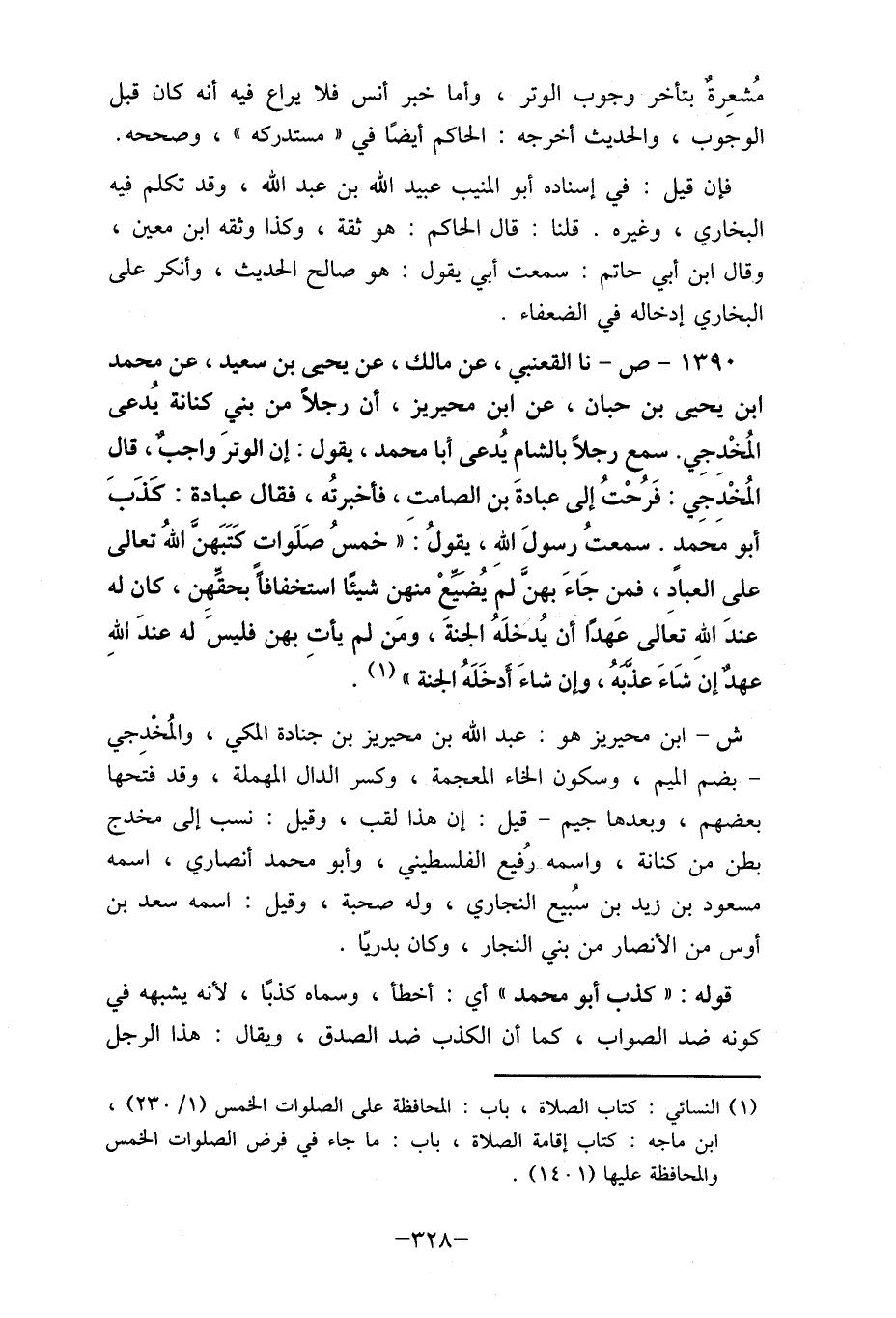 1390- ص- نا القعنبي، عن مالك، عن يحيى بن سعيد، عن محمد ابن يحيى بن حبان، عن ابن محيريز، أن رجلا من بني كنانة يُدعى المُخْدجِي. سمع رجلاً بالشام يُدعى آبا محمد، يقول: إن الوترَ واجب، قال المُخْدِجِي: فَرُحْتُ إلى عبادةَ بن الصامت، فأخبرتُه، فقال عبادة: كَذَبَ أبو محمد. سمعتُ رسولَ الله، يقولُ: َ " خمسُ صَلَوات كَتَبَهن اللهُ تعالى على العبادة، فمن جَاءَ بهن لمَ يُضيعْ منهن شيئا استخفافاً بحقِّهِن، كان له عندَ الله تعَالى عَهدا أن يُدخلَهُ الجنةَ، ومَن لم يأتِ بهن فليس له عندَ أدتها بها إنه شَاءَ عذبهُ، كان شاءَ أدخَلَهُ الجنة " (1) .