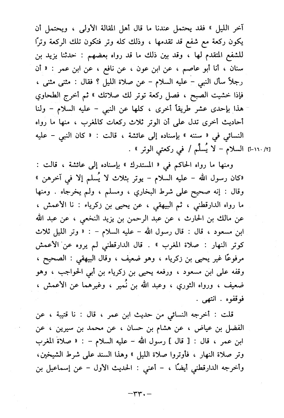 ومنها ما رواه الحاكم في " المستدرك " بإسناده إلى عائشة، قالت: "كان رسول الله- عليه السلام- يوتر بثلاث لا يُسلم إلا في آخرهن " وقال: إنه صحيح على شرط البخاري، ومسلم، ولم يخرجاه. ومنها ما رواه الدارقطني، ثم البيهقي، عن يحيى بن زكرياء: نا الأعمش، عن مالك بن الحارث، عن عبد الرحمن بن يزيد النخعي، عن عبد الله ابن مسعود، قال: قال رسول الله- عليه السلام-: " وتر الليل ثلاث كوتر النهار: صلاة المغرب لما. قال الدارقطني لم يروه عن الأعمش مرفوعًا غير يحمى بن زكرياء، وهو ضعيف، وقال البيهقي: الصحيح، وقفه على ابن مسعود، ورفعه يحيى بن زكرياء بن أبي الحواجب، وهو ضعيف، ورواه الثوري، وعبد الله بن نمير، وغيرهما عن الأعمش، في فوقفوه انتهي.