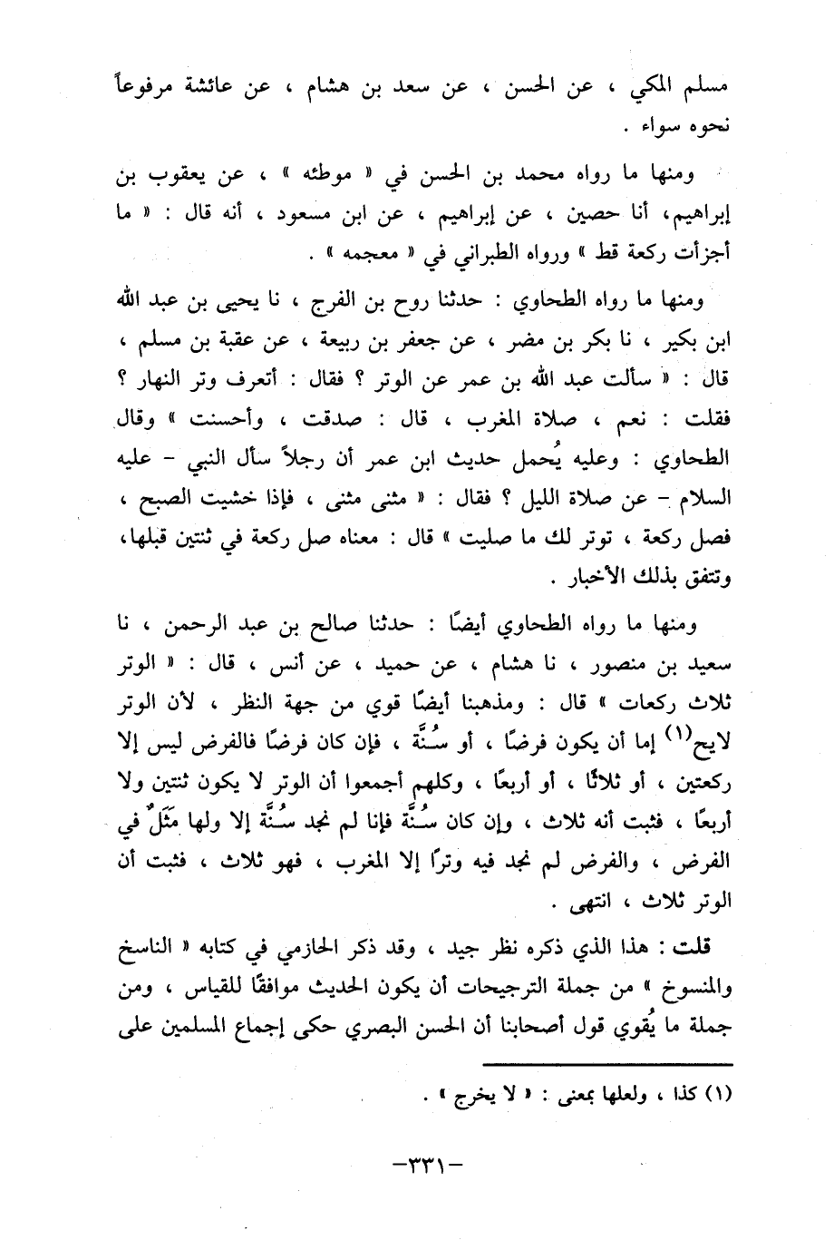 ومنها ما رواه الطحاوي أيضًا: حدثنا صالح بن عبد الرحمن، نا سعيد بن منصور، نا هشام، عن حميد، عن أنس، قال: " الوتر ثلاث ركعات " قال: ومذهبنا أيضا قوي من جهة النظر، لأن الوتر لايح (1) إما أن يكون فرضًا، أو سُنَة، فإن كان فرضًا فالفرض ليس إلا ركعتين، أو ثلاثا، أو أربعًا، وكلهم أجمعوا أن الوتر لا يكون ثنتي ولا أربعًا، فثبت أنه ثلاث، وإن كان لسُنَّة فأنا لم نجد لسُنَّة إلا ولها مَثَلٌ في الفرض، والفرض لم نجد فيه وترا إلا المغرب، فهو ثلاث، فثبت أن الوتر ثلاث، انتهى.