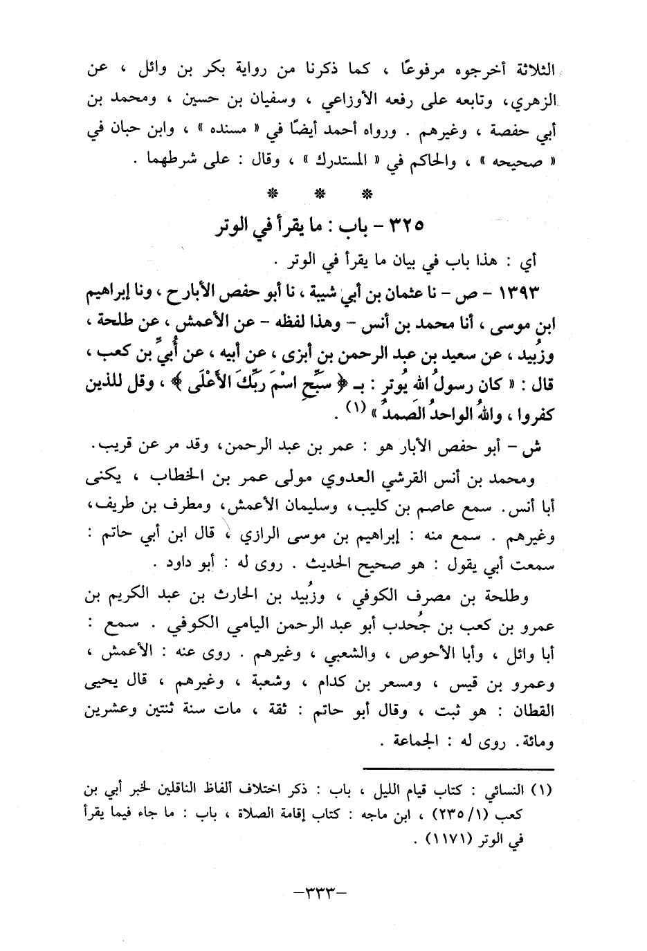 1393- ص- نا عثمان بن أبي شيبة، نا أبو حفص الأبار ح، ونا إبراهيم ابن موسى، أنا محمد بن أنس- وهذا لفظه- عن الأعمش، عن طلحة، وزُبيد، عن سعيد بن عبد الرحمن بن أبزي، عن أبيه، عن أبيِّ بن كعب، "