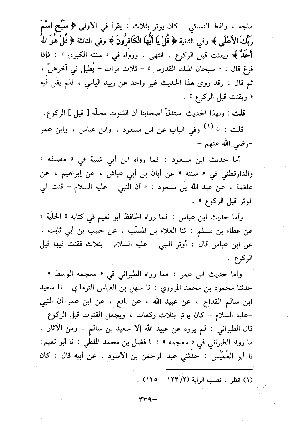 وأما حديث ابن عباس: فما رواه الحافظ أبو نعيم في كتابه " الحلْية " عن عطاء بن مسلم: ثنا العلاء بن المسيب، عن حبيب بن أبي ثابت، عن ابن عباس قال: أوتر النبي- كليه السلام- بثلاث فقنت فيها قبل الركوع.
