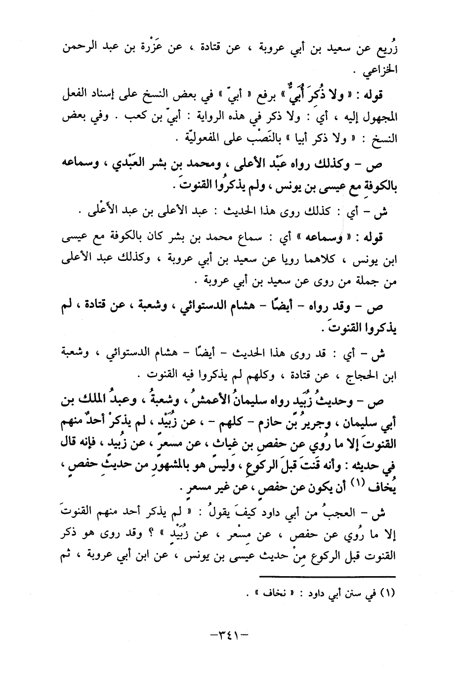 ش- العجبُ من أبي داود كيفَ يقولُ: " لم يذكر أحد منهم القنوتَ إلا ما رُوي عن حفص، عن مِسْعر، عن زُبَيْدٍ "؟ وقد روى هو ذكر القنوت قبل الركوع مِنْ حديث عيسى بن يونس، عن ابن أبي عروبة، ثم