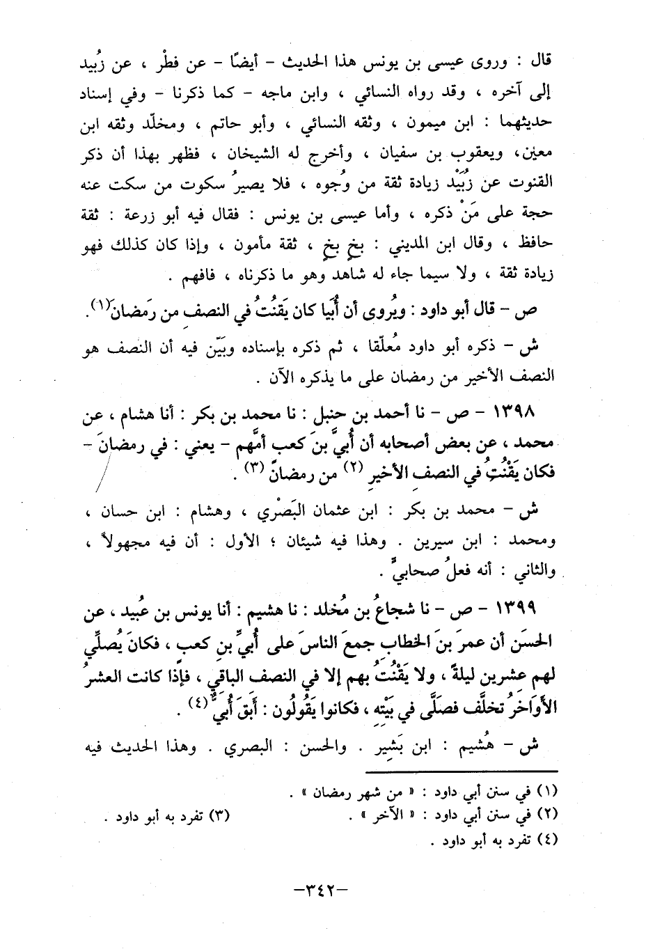 1398- ص- نا أحمد بن حنبل: نا محمد بن بكر: أنا هشام، عن محمد، عن بعض " أصحابه أن أبي بنَ كعب أمَّهم- يعني: في رمضانَ- فكان يَقْنُت في النصفِ الأخيرِ (2) من رمضانَ (3) . ش- محمد بن بكر: ابن عثمان البَصْري، وهشام: ابن حسان، ومحمد: ابن سيرين. وهذا فيه شيئان , الأول: أن فيه مجهولاً، والثاني: أنه فعلُ صحابي.