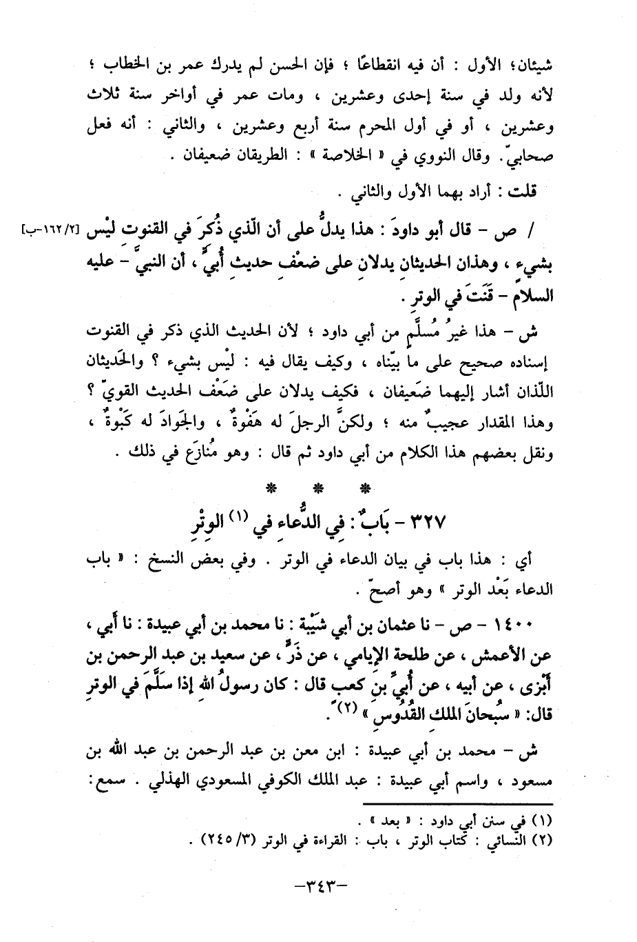 / ص- قال أبو داودَ: هذا يدل؟ على أن الذي ذُكرَ في القنوت ليْس [2/ 162 - ب] بشيء، وهذان الحديثانِ يدلانِ على ضعْفِ حديثِ أبي، أن النبي- عليه