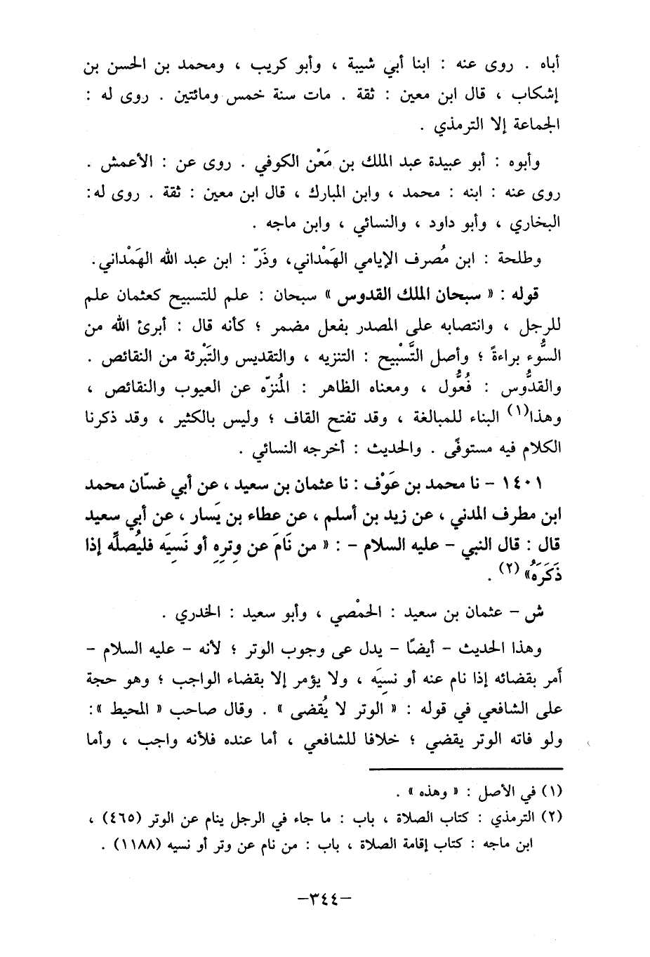 1401- نا محمد بن عَوْف: نا عثمان بن سعيد، عن أبي غسان محمد ابن مصرف المدني، عن زيد بن أسلم، عن عطاء بن يَسار، عن أبي سعيد قال: قال النبي- عليه السلام-: " من نَامَ عن وترِه أو نَسيَه فليُصلِّه إذا ذَكَرهَ" (2) .ً