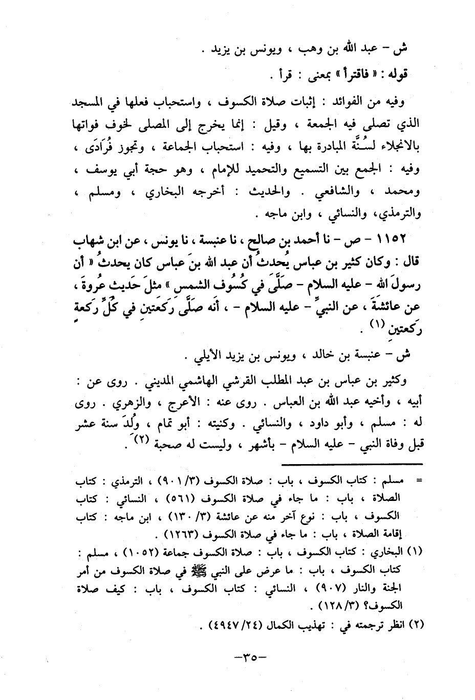 1152- ص- نا أحمد بن صالح، نا عنبسة، نا يونس، عن ابن شهاب قال: وكان كثير بن عباس يُحدثُ أن عبد الله بنَ عباس كان يحدثُ لا أن رسولَ اللهِ- عليه السلام- صلى في كُسُوف الشمسِ " مثلَ حَديث عُروةَ، عن عائشةَ، عن النبي- عليه السلام-، أنفه صلى ركعتين في كلّ رَكعة ركعتين (1) .ًَ ش- عنبسة بن خالد، ويونس بن يزيد الأيلي.