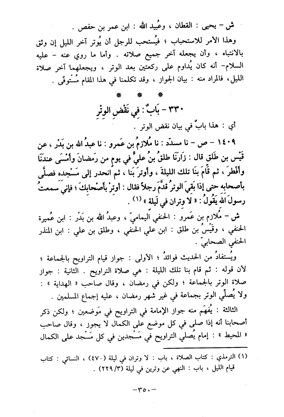 1409- ص- نا مسدد: نا مُلازمُ بن عَمرو: نا عبدُ الله بن بَدْر، عن قَيْس بن طَلق قال: زَارَنَا طلقُ بنُ عليه في يومٍ من رَمضانَ وأمْسَى عندَنَا وأفْطرَ، ثم قًامَ بنَا تلك الليلةَ، وأوترَ بينا، ثم انحدر إلى مَسْجلِهِ فصلى بأصحابه حتى إذا بَقِيَ الوترُ قامَ رجلاً فقال: أوترْ به"صْحابكَ؟ فإني سمعتُ رسولَ الله يَقُولُ: " لا وِتران في لَيلة " (1) .