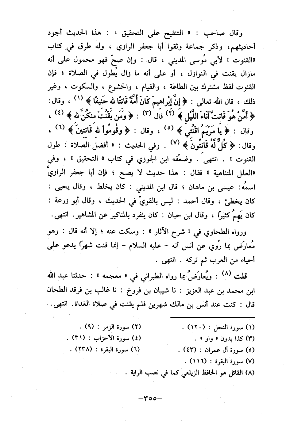 وقال صاحب: " التنقيح على التحقيق ": هذا الحديث أجود أحاديثهم، وذكر جماعة وثقوا أبا جعفر الرازي، وله طرق في كتاب " القنوت " لأبي مُوسى المديني، قال: وإن صغ فهو محمول على أنه مازال يقنت في النوازل، أو على انه ما زال يُطول في الصلاة , فإن القنوت لفظ مشترك بين الطاعة، والقيام، والخشوع، والسكوت، وغير ذلك، قال الله تعالى: {إِنَّ إبْراهيمَ كَانَ أمَّةَ قَانِتَا للهِ حَنِيفًا} (1) ، وقال: {أفَنْ هُوَ قَانت آنَاءَ الليل} (2) قاَل (3) : {ومَن يَقْنُتْ منكُن لله} (4) ، وقال: {يا مَرْيَمُ اقْنُتِي} (5) ، وقال: {وقُومُوا للهَ قَانتينً} (6) ، وقال: {كُل لهُ قَانِتُون} (7) . وفي الحديث: " أفضلَ الَصَلاة: طول القنوت " انتهى. وضعفه ابن الجوزي في كتاب "التحقيق " وفي " العلل المتناهية " فقال: هذا حديث لا يصح , فإن أبا جعفر الرازي اسمُه: عيسى بن ماهان , قال ابن المديني: كان يخلط، وقال يحيي: كان يخطئ، وقال أحمد: ليس بالقوي في الحديث، وقال أبو زرعة: كان يَهِمُ كثيرًا، وقال ابن حبان: كان ينفرد بالمناكير عن المشاهير. انتهى. ورواه الطحاوي في " شرح الآثار ": وسكت عنه , إلا أنه قال: وهو مُعارَض بما رُوي عن أنس أنه- عليه السلام- إنما قنت شهرًا يدعو على أحياء من العرب ثم تركه. انتهى.