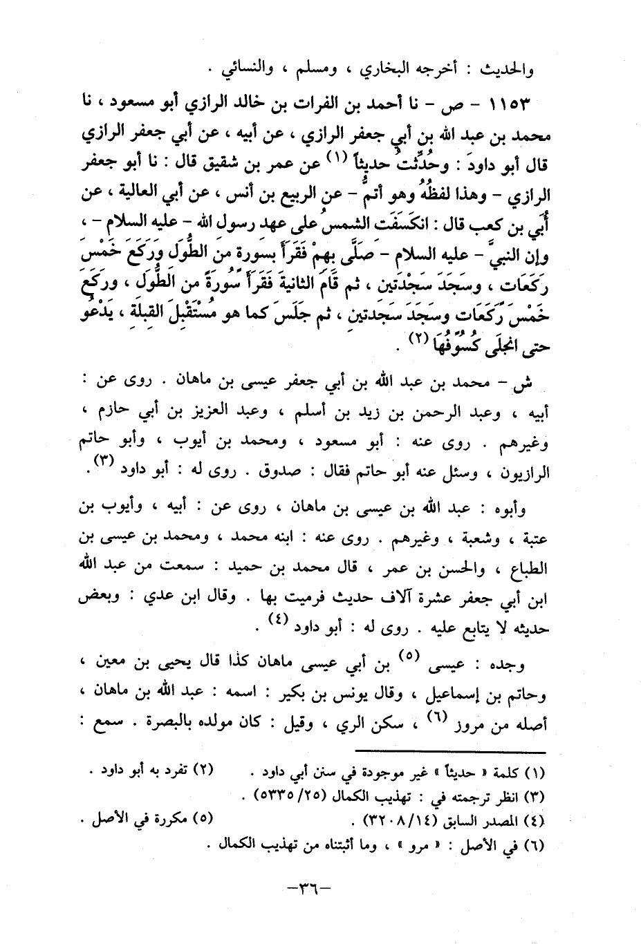 1153- ص- نا أحمد بن الفرات بن خالد الرازي أبو مسعود، نا محمد بن عبد الله بن أبي جعفر الرازي، عن أبيه، عن أبي جعفر الرازي قال أبو داودَ: وحُدّثت حديثا (1) عن عمر بن شقيق قال: نا أبو جعفر الرازي- وهذا لفظُهُ وهو أتمُّ- عن الربيع بن أنس، عن أبي العالية، عن أبي بن كعب قال: انكشفت الشمسُ على عهدِ رسول الله- عليه السلامِ-، وإن النبي- عليه السلامِ -َ صلى بهمْ فَقَرَأ بسورة منه الأُوَل وَرَكَعَ خمْسَ رَكَعَات، وسَجَدَ سَجْدتنِ، ثم قًامَ الثانيةَ فَقَرَأ سُورة من الَطُّوَل، ورَكَعَ خَمْسَ ركًعَات وسَجَدَ سَجدتيْ، ثم جَلَسَ كما هو مُسْتَقْبِلَ القبلَة، يَدْعو حتى انجلَى كُسُوفُهَا (2) .