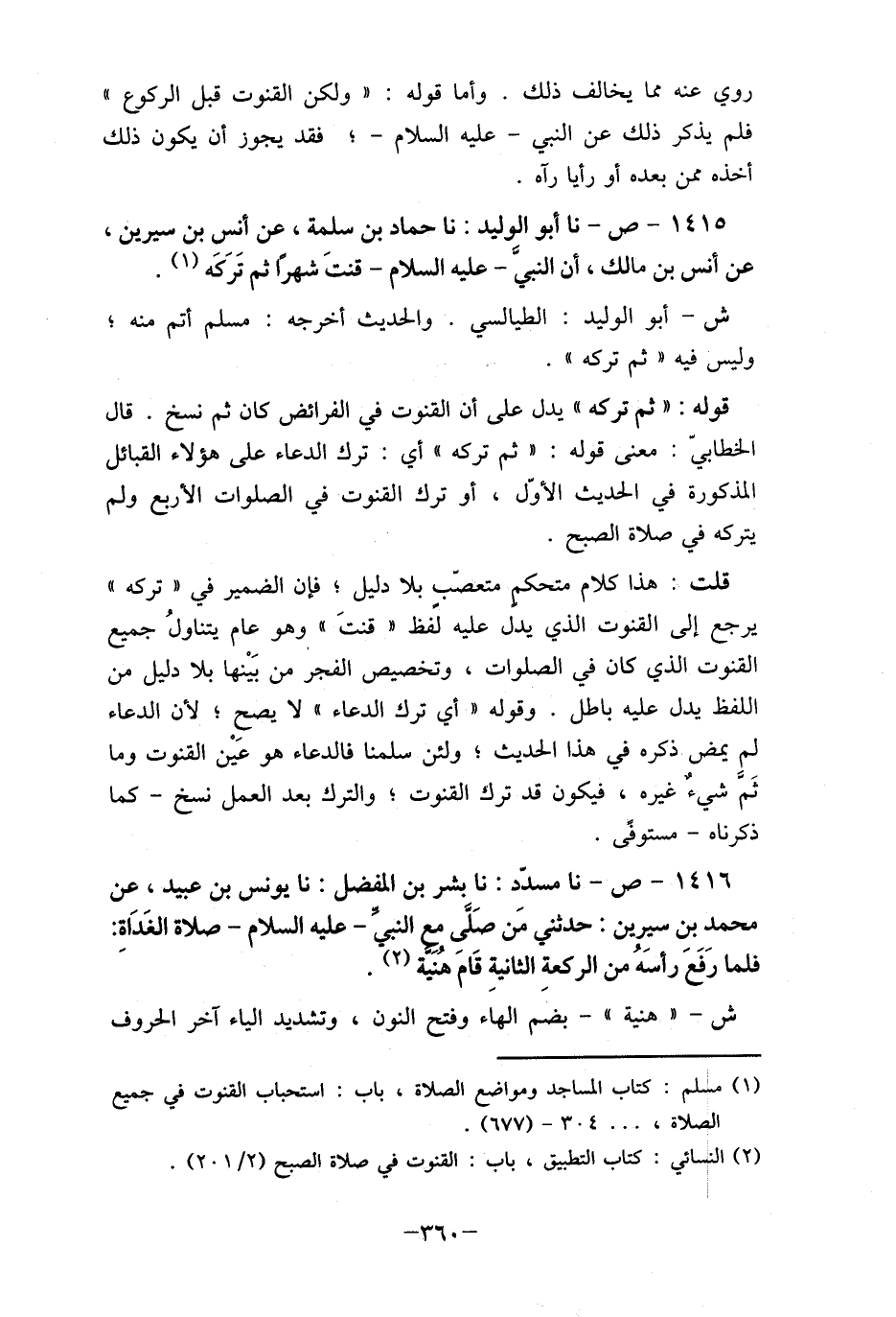 1415- ص- نا أبو الوليد: نا حماد بن سلمة، عن أنس بن سيرين، عن أنس بن مالك، أن النبي- عليه السلام- قنتَ شهرًا ثم تَرَكَه (1) . ش- أبو الوليد: الطيالسي. والحديث أخرجه: مسلم أتم منه , وليس فيه " ثم تركه ".