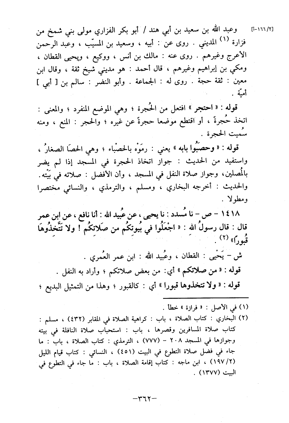 1418- ص- نا مُسدد: نا يحيى، عن عُبيد الله: أنا نافع، عن ابن عمر قال: قال رسولُ الله: " اجْعَلُوا في بُيوتِكُم من صَلاتكُم " ولا تَتَّخذُوهَا قُبورا " (2) .ً