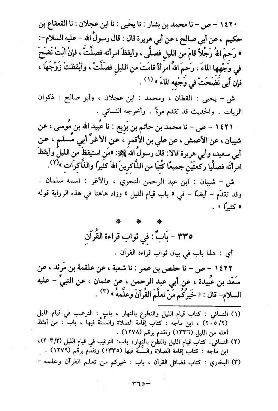 1420- ص- نا محمد بن بشار: نا يحيي: نا ابن عجلان: نا القعقاع بن حكيم، عن أبي صالح، عن أبي هريرة قال: قال رسولُ الله- عليه السلام-: " رَحِمَ اللهُ رَجُلاً قامَ من الليلِ فصلَّى، وأيقظَ امرأته فصلَّت، فإنْ أبَتْ نَضَحَ في وَجْهِهِا الماءَ، رَحِمَ اللهُ امرأةً قامَتْ من الليل فصَلَّتْ، وأيْقظتْ زَوْجَهَا، فإن أبى نَضَحَتْ في وَجْهِهِ الماءَ " (1) .