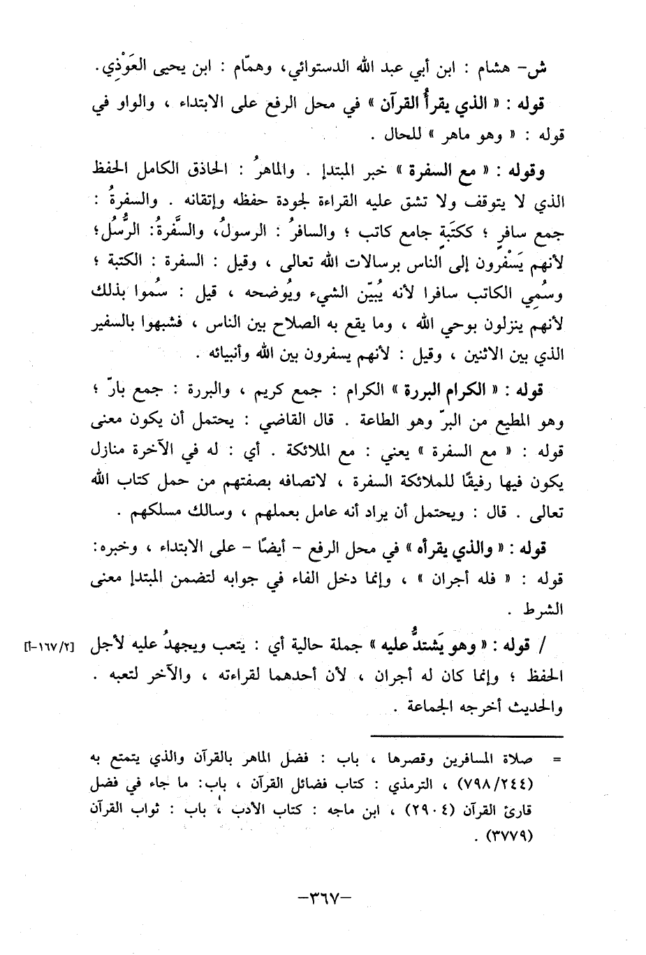 ش- هشام: ابن أبي عبد الله الدستوائي، وهمّام: ابن يحيي العَوْذي. قوله: " الذي يقرأ القراَن " في محل الرفع على الابتداء، والواو في قوله: " وهو ماهر " للحال.