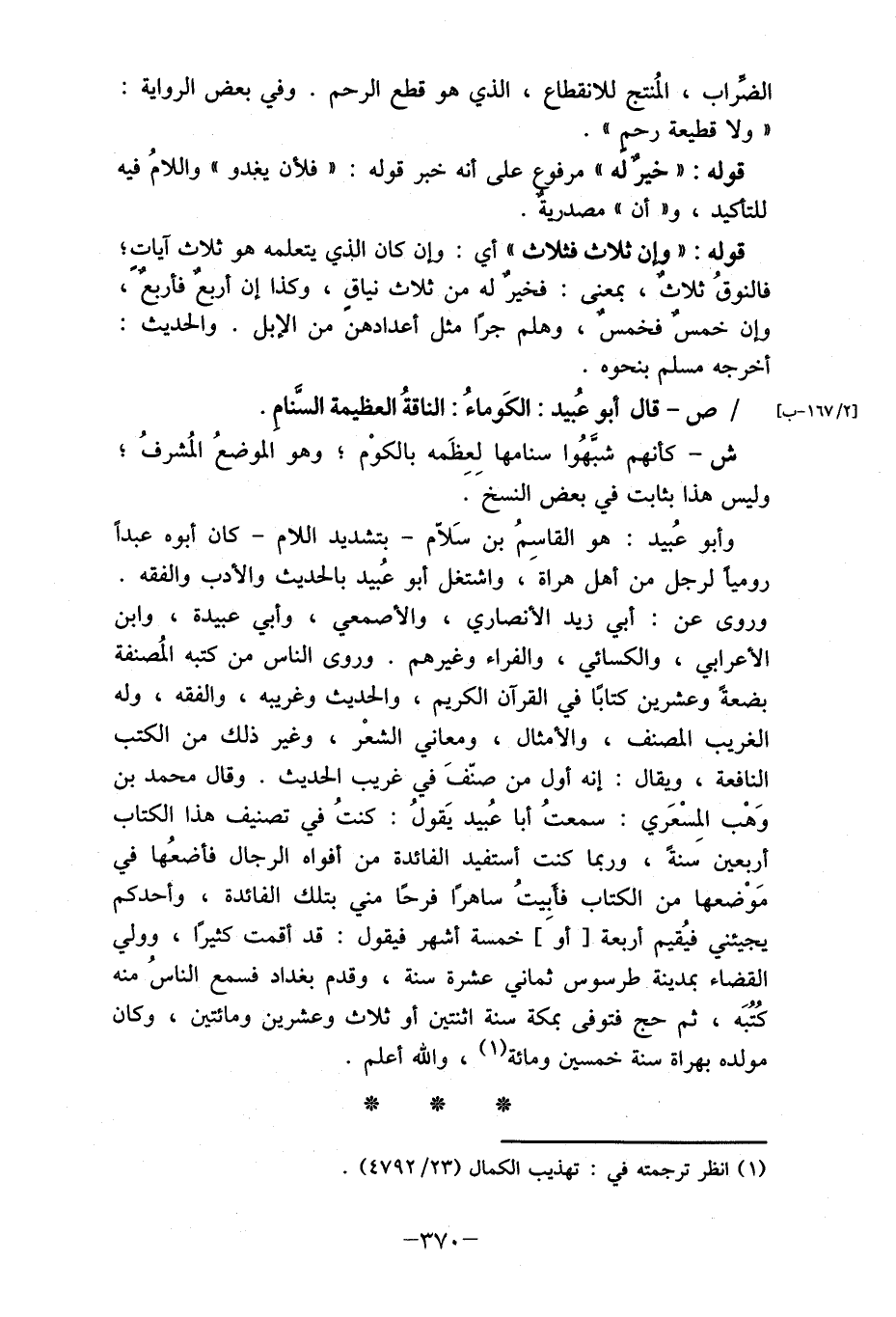وأبو عُبيد: هو القاسمُ بن سَلام- بتشديد اللام- كان أبوه عبدا روميا لرجل من أهل هراةَ، واشتغل أبو عُبيد بالحديث والأدب والفقه. وروى عن: أبي زيد الأنصاري، والأصمعي، وأبي عبيدة، وابن الأعرابي، والكسائي، والفراء وغيرهم. وروى الناس من كتبه المُصنفة بضعةً وعشرين كتابًا في القرآن الكريم، والحديث وغريبه، والفقه، وله الغريب المصنف، والأمثال، ومعاني الشعْر، وغير ذلك من الكتب النافعة، ويقال: إنه أول من صنفَ في غريب الحديث. وقال محمد بن وَهْب المِسْعَري: سمعتُ أبا عُبيد يَقولُ: كنتُ في تصنيف هذا الكتاب أربعة سنةً، وربما كنت استفيد الفائدة من أفواه الرجال فأضعُها في مَوْضعها من الكتاب فأبيتُ ساهرًا فرحًا مني بتلك الفائدة، وأحدكم يجيئني فيُقيم أربعة [أو] خمسة أشهر فيقول: قد أقمت كثيرًا، وولي القضاء بمدينة طرسوس ثماني عشرة سنة، وقدم بغداد فسمع الناسُ منه كُتُبَه، ثم حج فتوفى بمكة سنة اثنين أو ثلاث وعشرين ومائتي، وكان مولده بهرام سنة خمسين ومائة (1) ، والله أعلم.