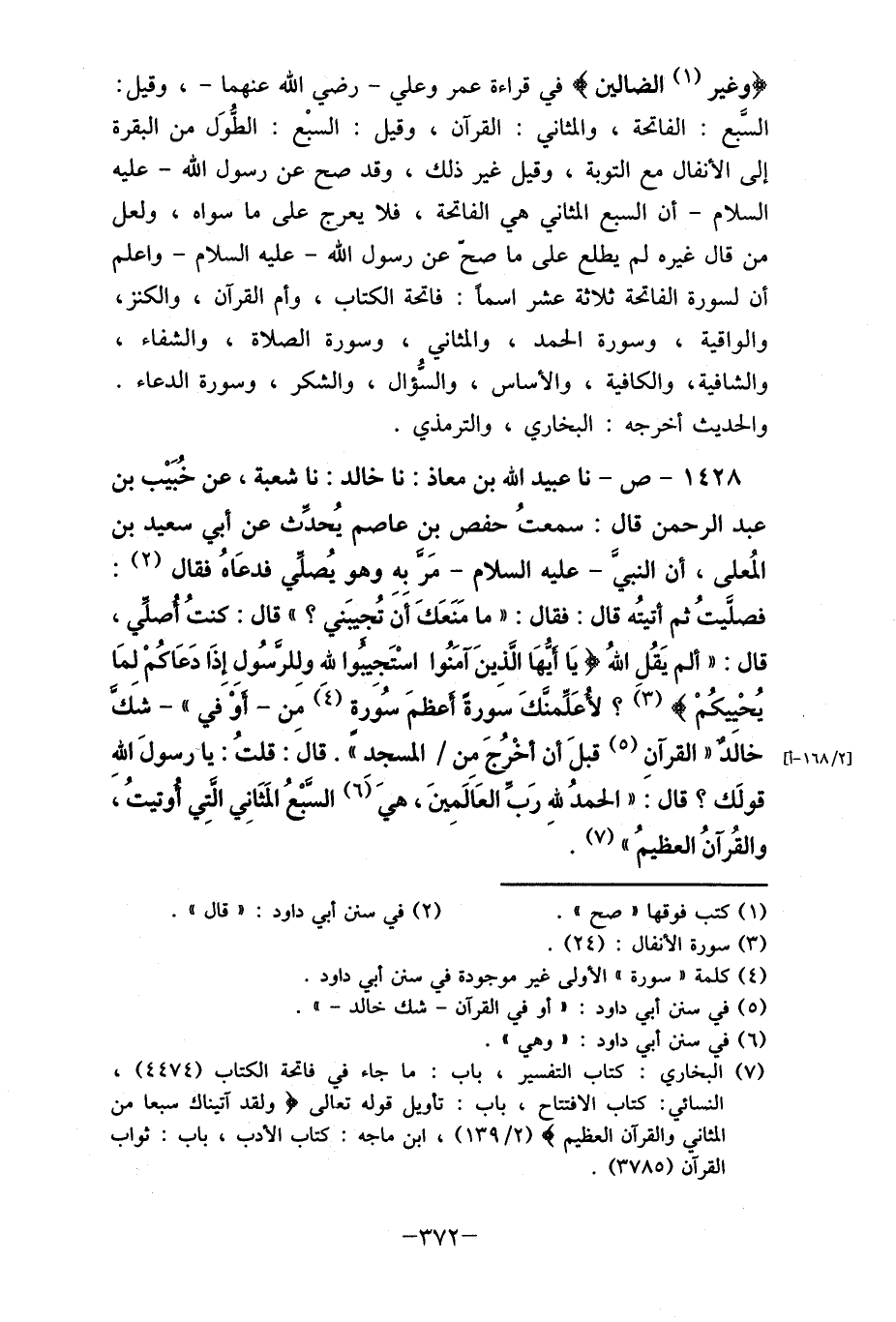 1428- ص- نا عبيد الله بن معاذ: نا خالد: نا شعبة، عن خُبَيْب بن عبد الرحمن قال: سمعتُ حفص بن عاصم يُحدَث عن أبي سعيد بن المُعلى، أن النبي- عليه السلام- مَر بهِ وهو يُصلي فدعَاهُ فقال (2) : فصليتُ ثم أتيتُه قال: فقال: " ما مَنَعَكَ أَن تُجيبَني؟ " قال: كنتُ أصلي، قال: " ألم يَقُل اللهُ {يا أيهَا الذِينَ آمَنُوا اسْتَجِيبوا لله ولِلرَّسُولِ إِذَا دَعَاكُمْ لمَا يُحْييكُمْ} (3) ؟ لأعَلِّمنكَ سورةً أعظمَ سُورة (4) مِن- أوْ في " - شَك خالَد " القرآنِ (5) قبلَ أن أخْرُجَ مِن/ المسجد ". قال: قلتُ: يا رسولَ الله قولَك؟ قال: " الحمدُ لله رب العَالَمينَ، هيَ (6) السبع المَثَانِي التِي أوتيتُ، والقُرآنُ العظيمُ " (7) .َ