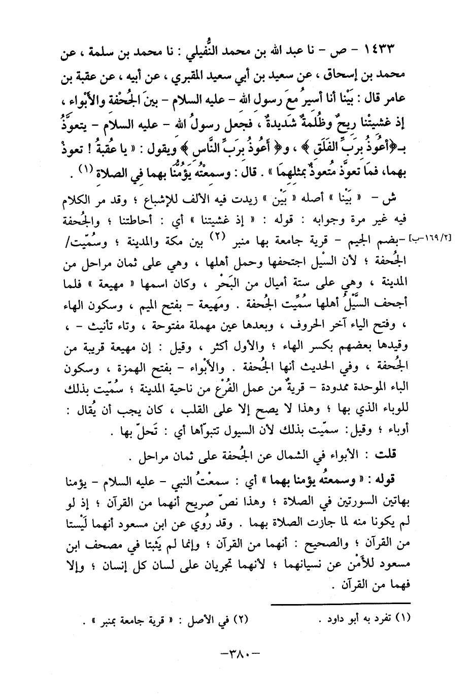 1433- ص- نا عبد الله بن محمد النُّفيلي: نا محمد بن سلمة، عن محمد بن إسحاق، عن سعيد بن أبي سعيد المقبري، عن أبيه، عن عقبة بن عامر قال: بَيْنا أنا أسيرُ معَ رسولِ الله- عليه السلام- بينَ الجُحْفة والأبْواء، إذ غشيتْنا رٍيحٌ وظُلَمة شَديدةٌ، فجَعل رسولُ اللهِ- عليه السلاَم- يتعوَّذُ ب {أعُوَذُ بِربِّ الفَلَقِ} ، و {أعُوذُ بِرَبِّ الناسِ} ويقول: " يا عُقبة " تعوذ بهما، فمَا تعوَّذ مُتعوذ بمثلِهِمَا ". قال: وسمِعْتُه يَؤُمنا بهما فِي الصلاةِ (1) .