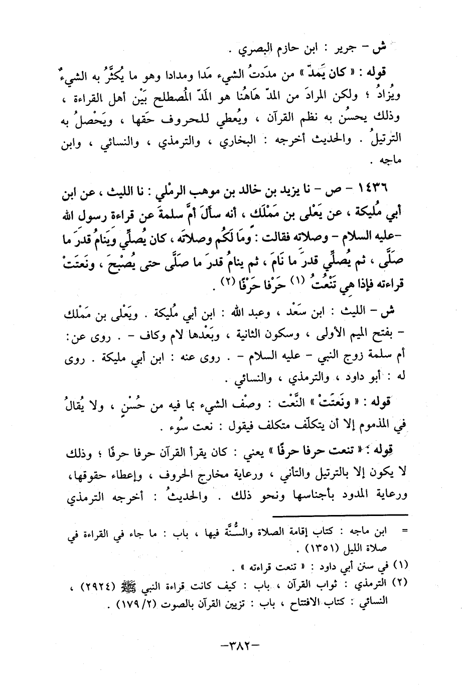 1436- ص- نا يزيد بن خالد بن موهب الرمْلي: نا الليث، عن ابن أبي مُليكة، عن يَعْلى بن مَمْلَكٍ، أنه سألَ أمَ سلمة عن قراءة رسولِ الله - عليه السلام- وصلاته فقالت: ومَا لَكُم وصلاتَه، كان يُصلِّي ويَنامُ قدرَ ما صلى، ثم يُصلّي قدر ما نَامَ، ثم ينامُ قدرَ ما صلى حتى يُصْبحَ، ونَعتَتْ قراءته فإذا هِي تَنْعُتُ (1) حَرْفا حَرْفًا (2) .