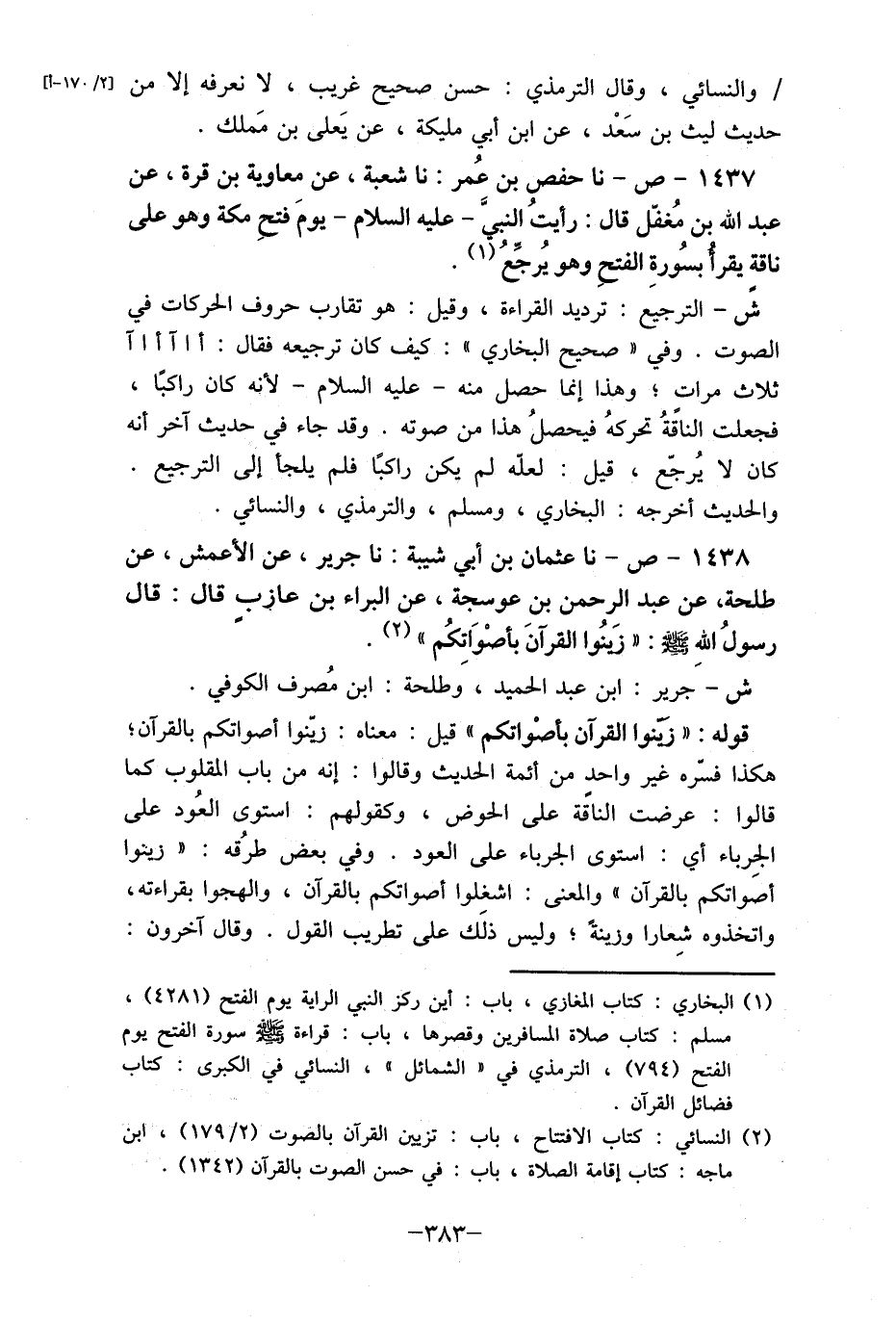 1437- ص- نا حفص بن عُمر: نا شعبة، عن معاوية بن قرة، عن عبد الله بن مُغفّل قال: رأيتُ النبيَّ- عليه السلام- يومَ فتح مكة وهو على ناقة يقرأ بسُورةِ الفتحِ وهو يُرجِّعُ (1) .