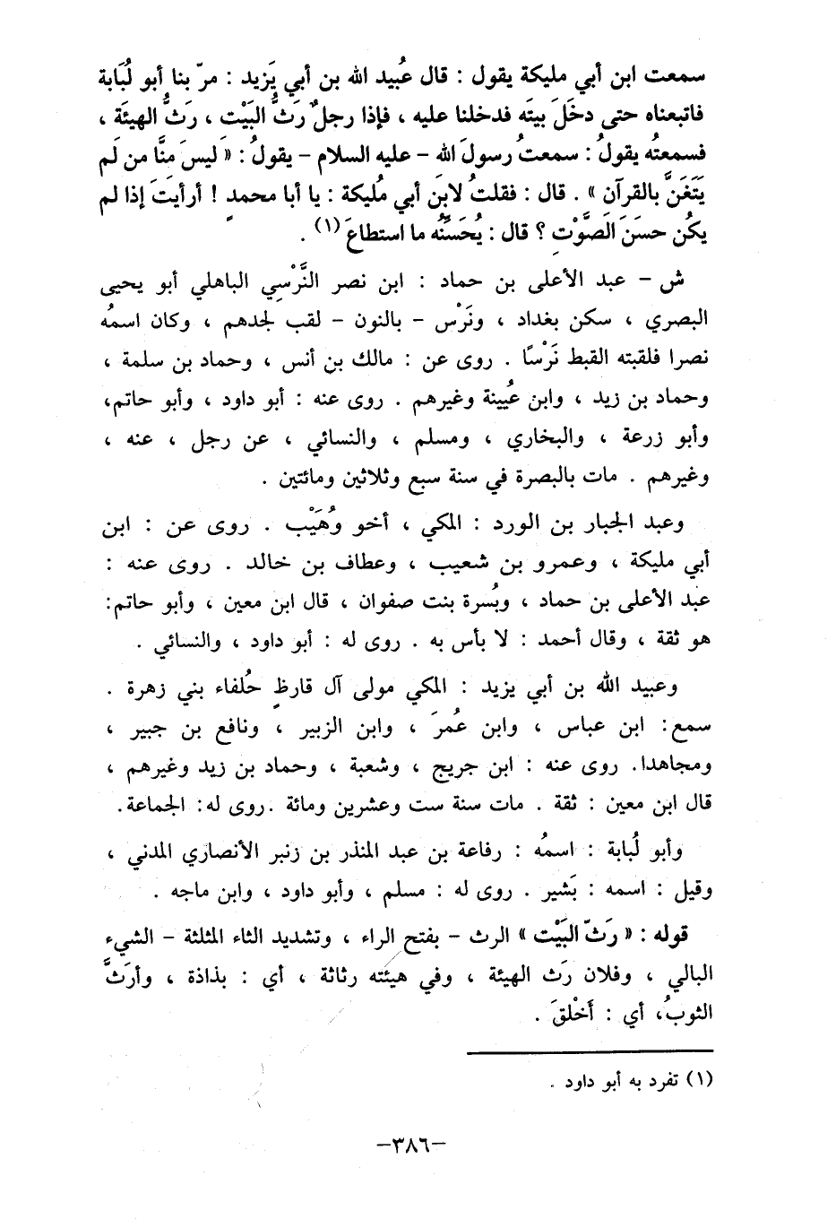 وعبد الجبار بن الورد: المكي، أخو وُهَيْب. روى عن: ابن أبي مليكة، وعمرو بن شعيب، وعطاف بن خالد. روى عنه: عبد الأعلى بن حماد، وبُسرة بنت صفوان، قال ابن معين، وأبو حاتم: هو ثقة، وقال أحمد: لا بأس به. روى له: أبو داود، والنسائي. وعبيد الله بن أبي يزيد: المكي مولى يل قارظ حُلفاء بني زهرة. سمع: ابن عباس، وابن عُمرَ، وابن الزبير، ونافع بن جبير، ومجاهدا. روى عنه: ابن جريج، وشعبة، وحماد بن زيد وغيرهم، قال ابن معين: ثقة. مات سنة ست وعشرين ومائة. روى له: الجماعة. وأبو لبابة: اسمُه: رفاعة بن عبد المنذر بن عنبر الأنصاري المدني، وقيل: اسمه: بَشير. روى له: مسلم، وأبو داود، وابن ماجه. قوله: " رَث البَيْت، الرث- بفتحِ اِلراء، وتشديد الثاء المثلثة- الشيء البالي، وفلان رَث الهيئة، وفي هيئَته رثاثة، أي: بذاءة، وأرَث الثوب، أي: أخْلقَ.
