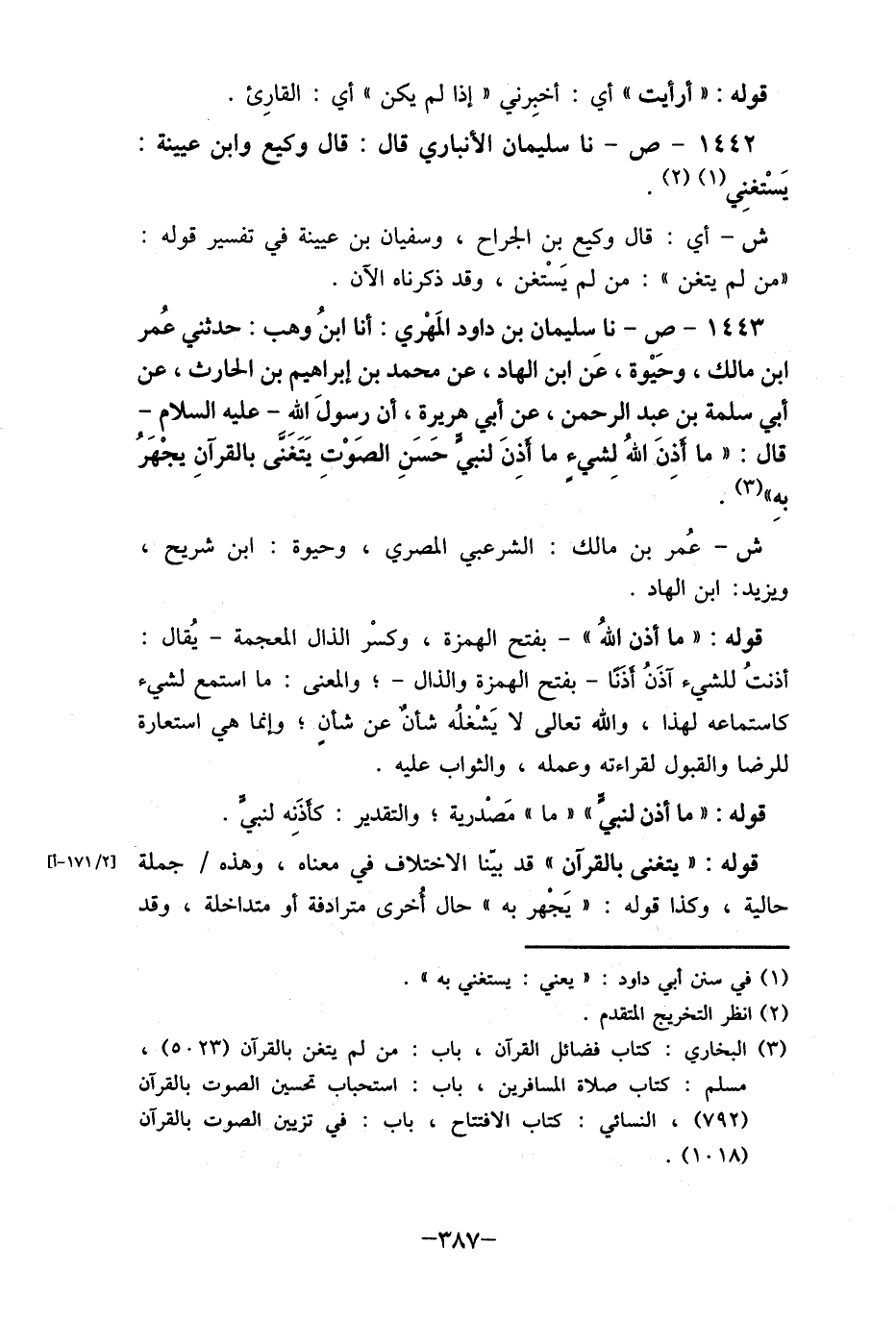 1443- صِ- نا سليمان بن داود المَهْري: أنا ابنُ وهب: حدثني عُمر ابن مالك، وحيْوة، عَن ابن الهاد، عن محمد بن إبراهيم بن الحارث، عن أبي سلمة بن عبد الرحمن، عن أبي هريرة، أن رسولَ اللهِ- عليه السلام- قال: " ما أذنَ اللهُ لشيء ما أذنَ لنبي حَسَن الصَوْت يَتَغنَّى بالقراَن يجْهَرُ بهِ " (3) .ًًًَ
