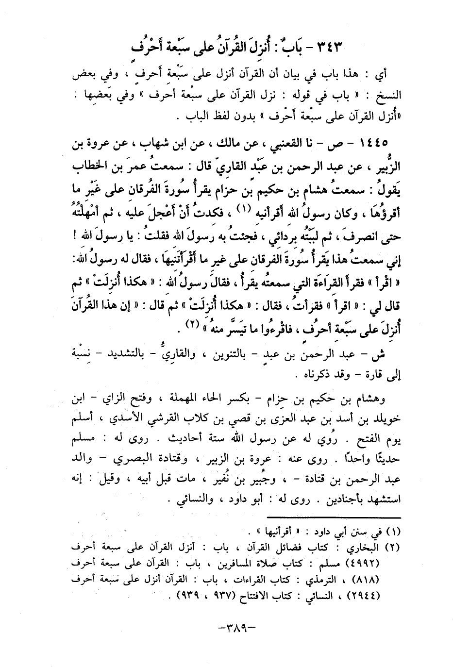 1445- ص- نا القعنبي، عن مالك، عن ابن شهاب، عن عروة بن الزُّبير، عن عبد الرحمن بن عَبْدٍ القارِي قال: سمعتُ عمرَ بن الخطاب يَقولُ: سمعتُ هشام بن حكيم بن حزام يقرأ سُورةَ الفُرقانِ على غَيْر ما أقرؤُهَا، وكان رسولُ الله أقرأنيهِ (1) ، فكِدتُ أنْ أعْجلَ عليه، ثم أمْهَلتُهُ حتى انصرفَ، ثم لبَبْتُه بِرَدائِي، فجئتُ به رسولَ الله فقلتُ: نا رسولَ الله! إني سمعتُ هذا يَقرأ سُورةَ الفرقانِ على غيرِ ما أقْرَأتَنَيهَا، فقال له رسولُ الَله: " اقْرأ " فقرأ القرَاءَة التي سمعتُه يقرأ، فقالَ رسولُ اَللهِ: " هكذا أنزِلَتْ " ثم قال لي: " اقرأَ " فقرأتُ، فقال: " هكذا أنزِلَتْ " ثم قال: " إن هذا القُرآنَ أنزِلَ على سبعة أحرُفٍ، فاقْرءُوا ما تيَسر منهُ " (2) .